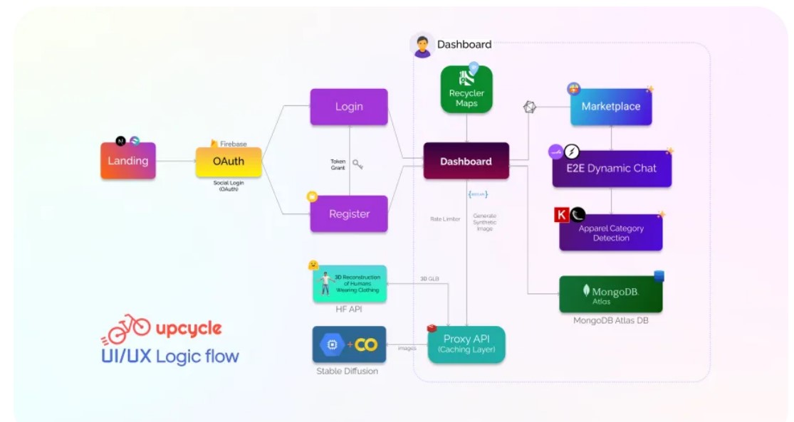 Sign-in / Sign-up with Google (OAuth) — Users can sign-up normally but Tailors/Seamstresses etc. have to fill-up a form to register themselves. (This is done to prevent spam) Once logged in, user will be redirected to main dashboard to explore tailors in their proximity. Users can choose the one that suits their needs and preferences. Users can also filter by a specific service and view the tailor's location, star rating, and services offered. Users can easily message the tailor, upload images, and specify the exact service they want. Users and tailors can mutually decide a time slot that works for both to collect and deliver the goods. Users can also generate custom clothing for themselves leveraging our bleeding-edge Stable Diffusion model. Moreover, we also provide "3D Reconstruction of Humans Wearing Clothing" (Easter Egg!) for a limited period. Users can view their current orders on their profile page and follow tailors they like. On successful completion of orders, Tailors can get reviews, earn points and gain followers on the app. In the future, Upcycle plans to implement a delivery-style courier system using local cyclists or riders.