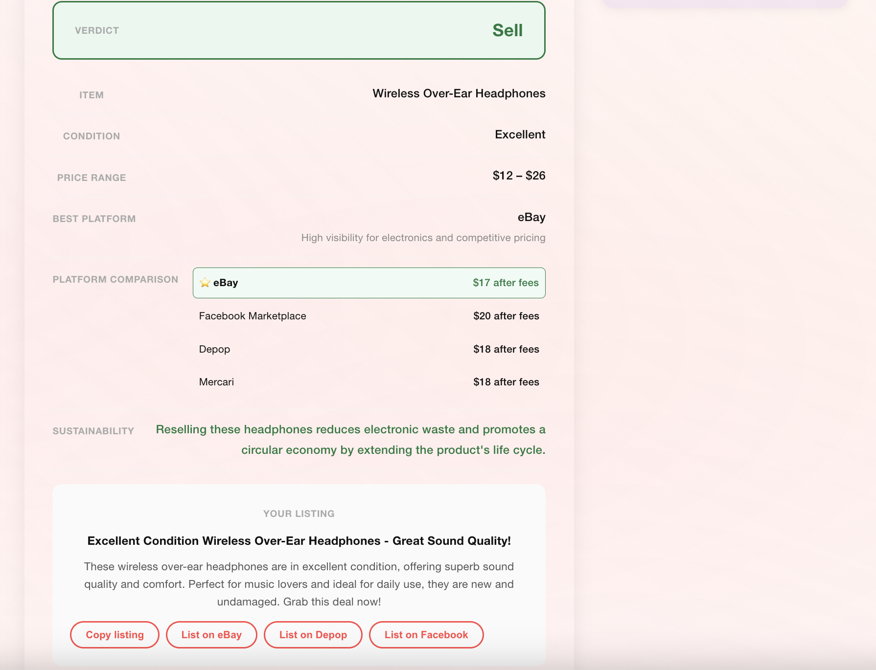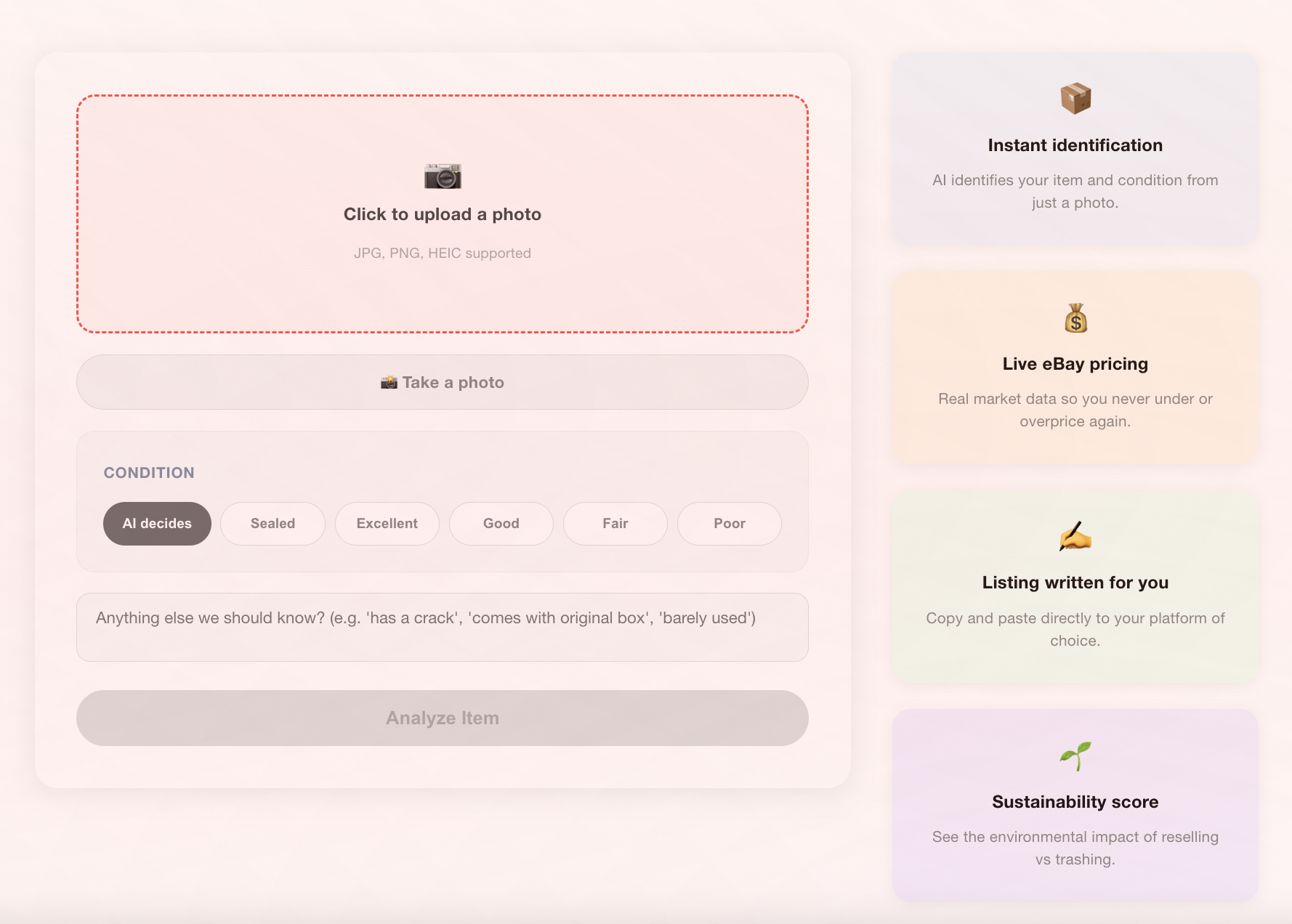 We created our frontend to handle the photo upload and send it to OpenAI's GPT-4o, which identifies the item and writes the listing. At the same time, our backend calls SerpApi to pull real sold prices from eBay. We combine those two results to show the user accurate pricing and a ready-to-post listing. Frontend is deployed on Vercel, backend is on Railway, both connected to GitHub so every push automatically redeploys.