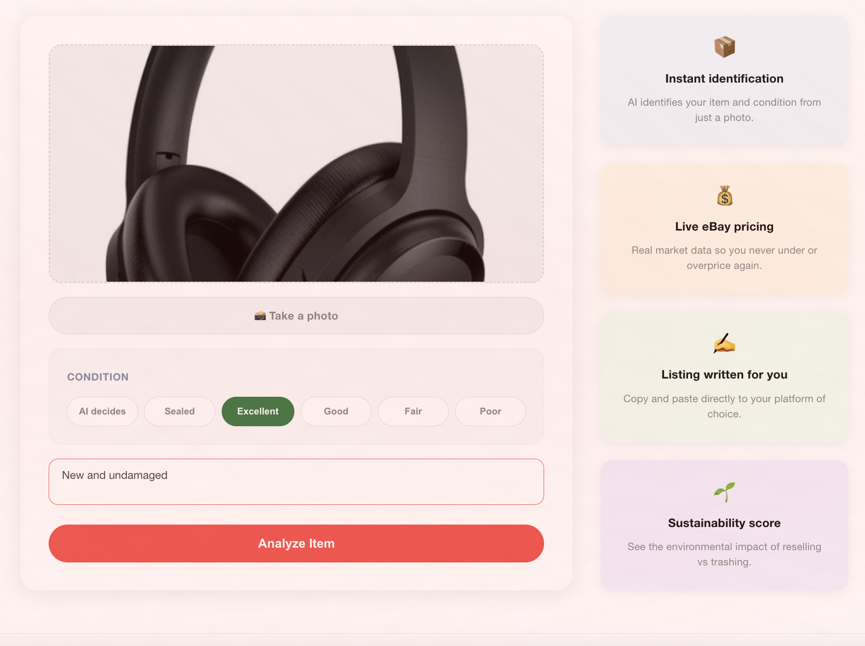 UpCycle has a user submit an image or take a photo, then uses that and optionally submitted additional information to give an analysis of the price, as well as previous sale prices and a recommended platform to sell it on.