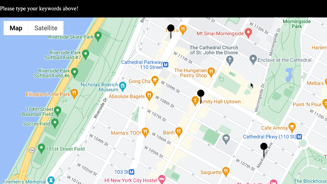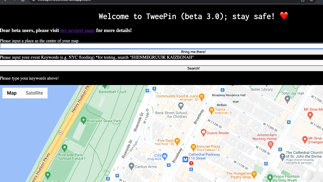 - The filtered tweets will then be rendered on a 2D map, right at the location they mentioned; e.g. a tweet mentioning "116th street and broadway" will be represented as a Pin placed at the said location.