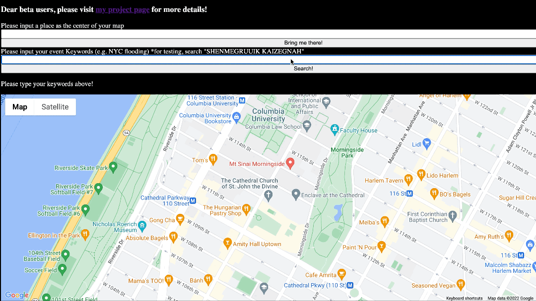 In late July last year, when Zhengzhou (Henan, China) was struck by heavy flooding, many people resorted to Weibo for spreading location-specific warning messages or posting distress signals. During that time, me and hundreds of fellow volunteers spent 5 sleepless nights consolidating such information from social media into online spreadsheets. Same year in August when I moved to NYC for college, Hurricane Ida flooded the city, and floodings occur frequently whenever there is a heavy raining. Through those experiences, I came to realize the importance of having a tool that assists the gathering, organizing, and verification of information during public emergencies.
