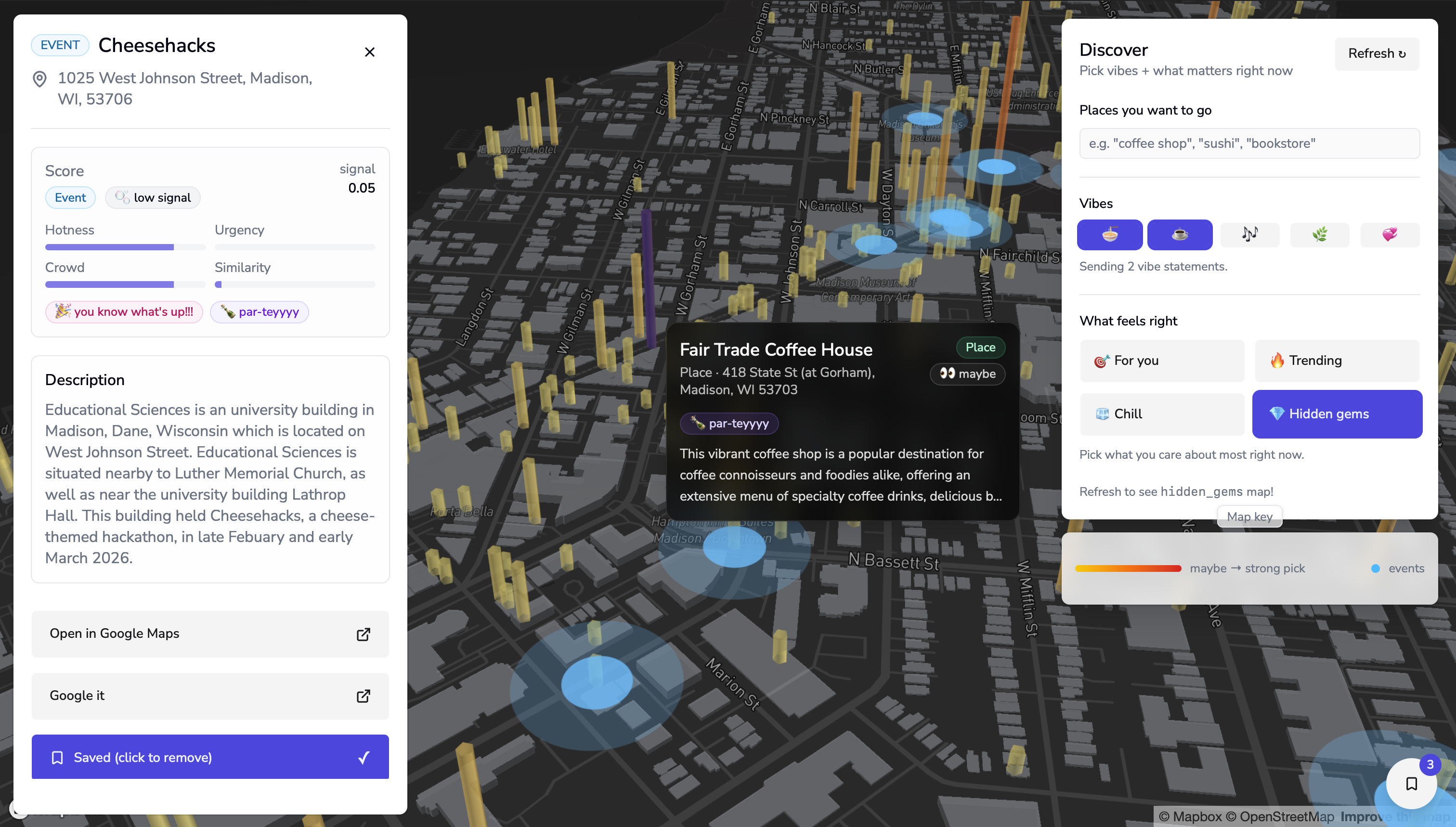 We’re proud that we built an end-to-end system — from data ingestion and scoring to an interactive visualization — within a short hackathon timeframe. We successfully combined multiple signals into a contextual score and translated it into a spatial visualization that clearly responds to user input. Most importantly, we created something that helps people understand their environment at a glance rather than browsing venue by venue.