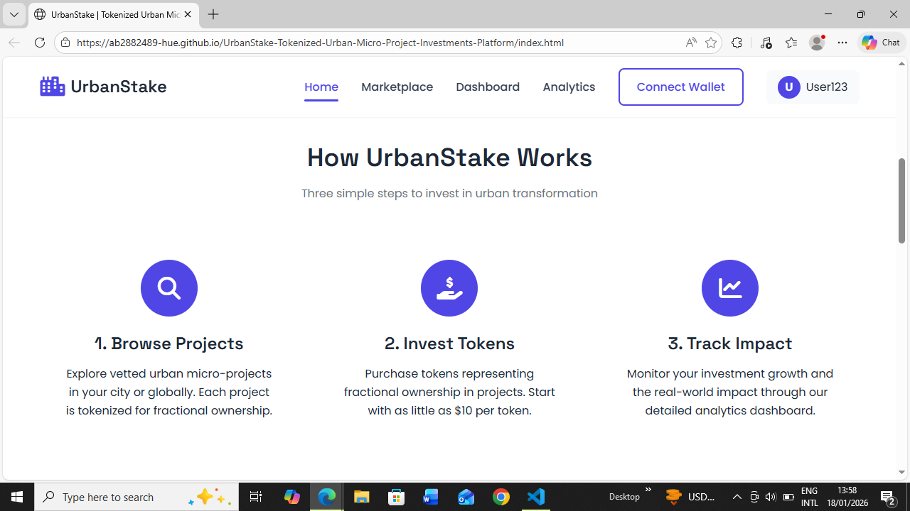 UrbanStake is a web platform that allows users to invest small amounts into tokenized urban micro-projects such as renewable energy installations, community infrastructure, and sustainability initiatives. Each project is represented through digital tokens that simulate fractional ownership. Users can: • Browse urban projects • Invest using tokens • Track portfolio performance • View measurable real-world impact such as CO₂ reduction, jobs created, energy saved, and households benefited All impact data is presented transparently through an analytics dashboard.