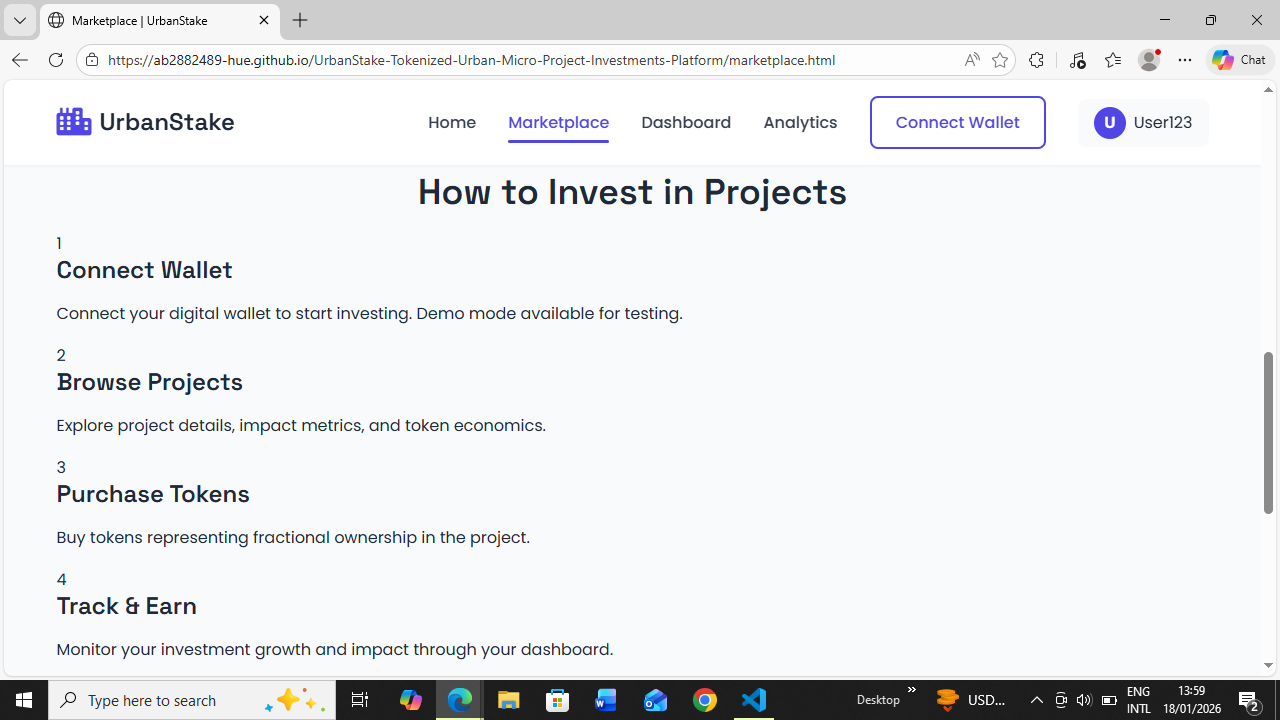 We built UrbanStake as a hackathon-ready, lightweight web application focused on clarity and usability. • Frontend was developed using HTML, CSS, and Vanilla JavaScript • A mock backend was implemented using browser localStorage to simulate users, projects, and investments • Token allocation and ownership logic was simulated to represent real-world asset tokenization • Impact metrics were calculated using simple, explainable formulas • Analytics and charts were visualized to clearly communicate impact The project was deployed live using GitHub Pages for easy access and demonstration.