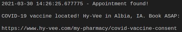 Every minute, this script scans the api provided by Vaccine Spotter to find COVID Vaccine appointments matching specified search criteria. If an appointment is found, it will output to the CLI and send a text via Twilio!