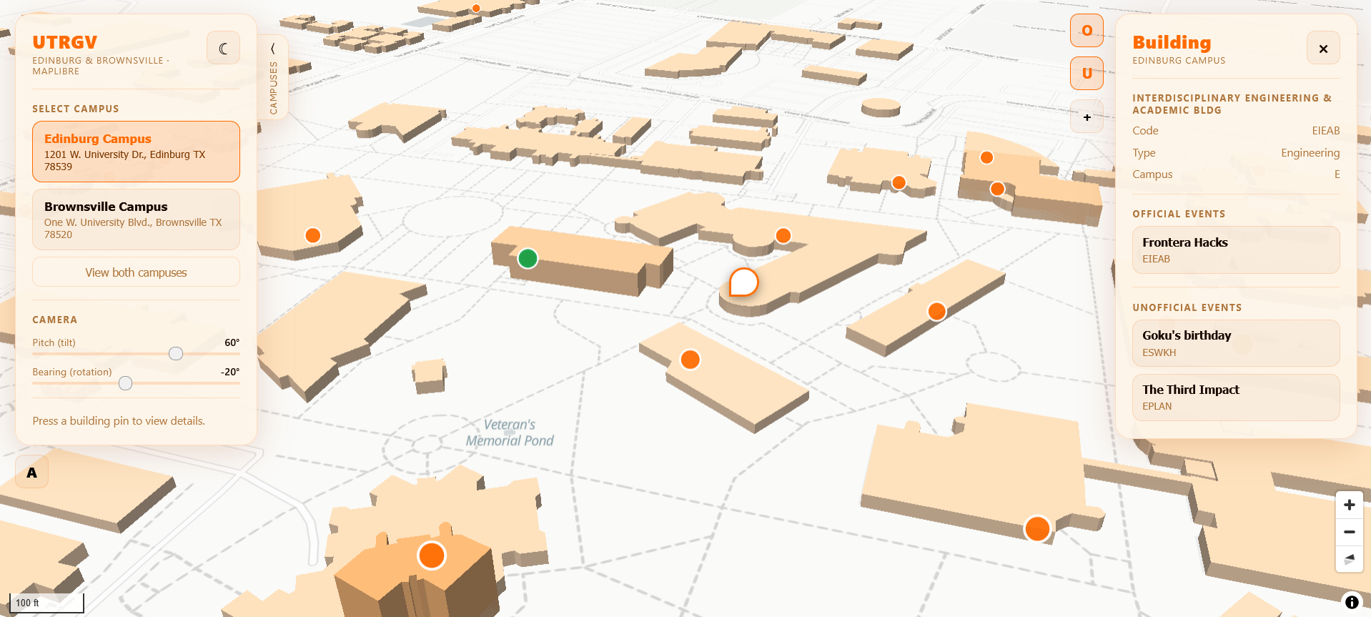 We built this project because of our experience as freshmen at UTRGV. Early on, finding buildings, figuring out where events were happening, and simply understanding the campus felt harder than it needed to be—especially when you’re new and everything is unfamiliar. We wanted to create the kind of tool we wished existed at the time: an interactive 3D campus map that makes it easy to explore locations and quickly see what’s happening around you. That freshman perspective shaped the goal of the project from the start: make campus navigation and event discovery more intuitive and less stressful.