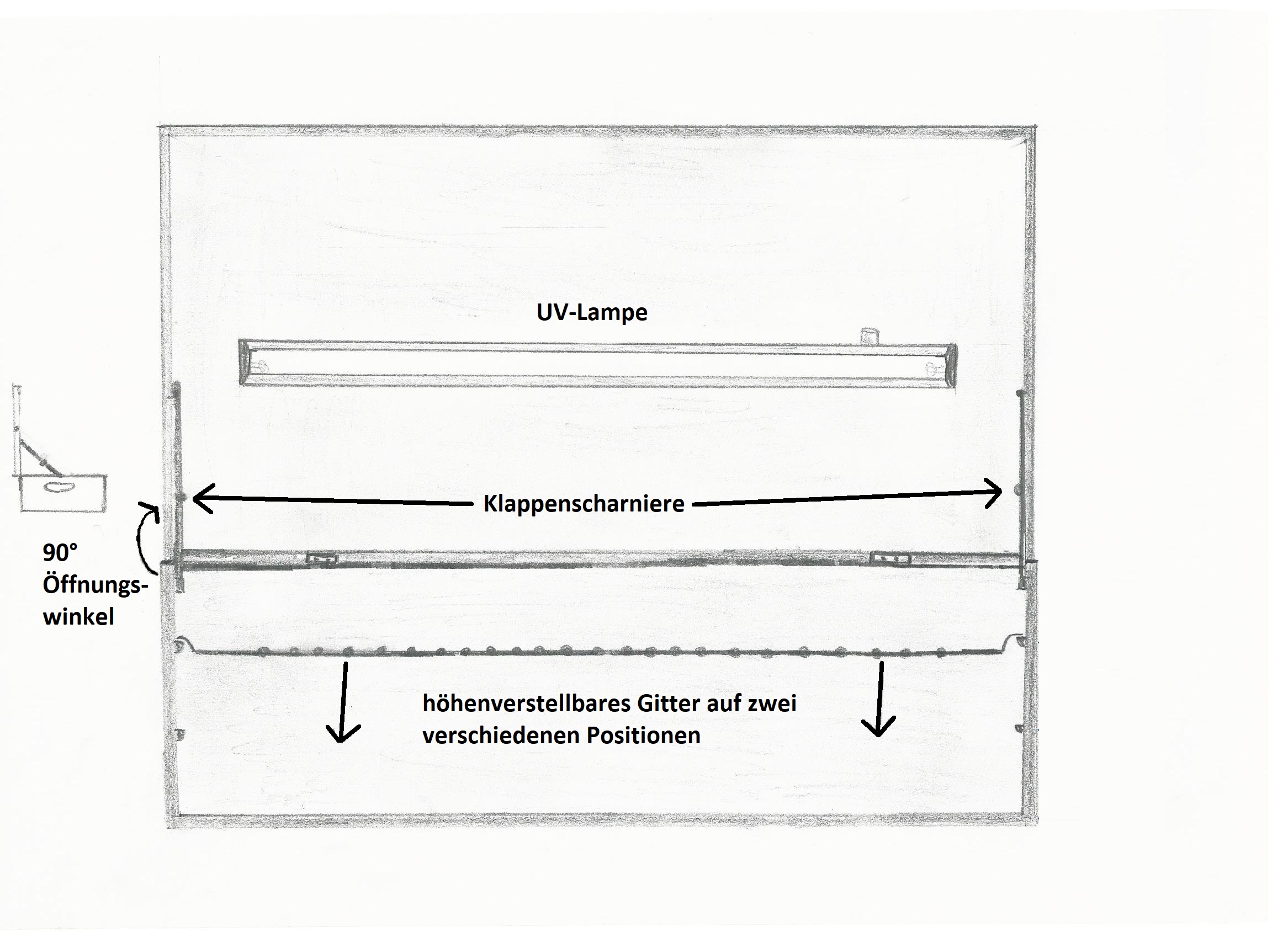 Der Prototyp besteht außen aus Holz. Das serienfertige Gerät soll jedoch außen aus Kunststoff bestehen, wobei die Desinfektionskammer wie im Prototyp innen vollständig mit Aluminium ausgekleidet sein wird. Dieses Metall reflektiert 80% der auftreffenden Strahlung , sodass die UV-Strahlung, die von der Lampe ausgeht, fast vollständig wieder ins Lumen reflektiert wird. Dies ermöglicht eine effektivere Bestrahlung. Damit die UV-Strahlen von allen Seiten wirken können, ist das Gitter vorgesehen, welches im Prototyp auf halber Höhe und im Endprodukt in zwei Höhen eingelegt werden kann. Zur Desinfektion kabelgebundener Kleingeräte wurden zwei abgedichtete Aussparungen in das Gehäuse eingearbeitet, durch die die Kabel durchgeführt werden können. So stören die Kabel die Bestrahlung nicht und die Geräte müssen nicht ausgesteckt werden.