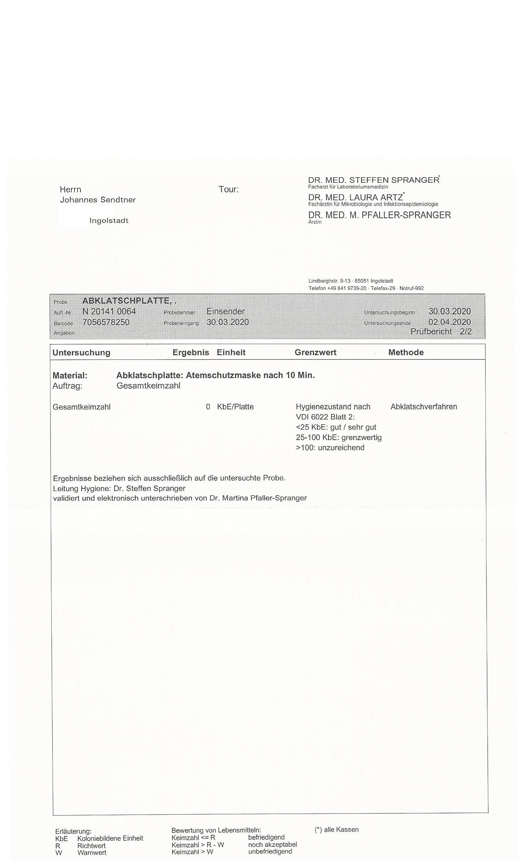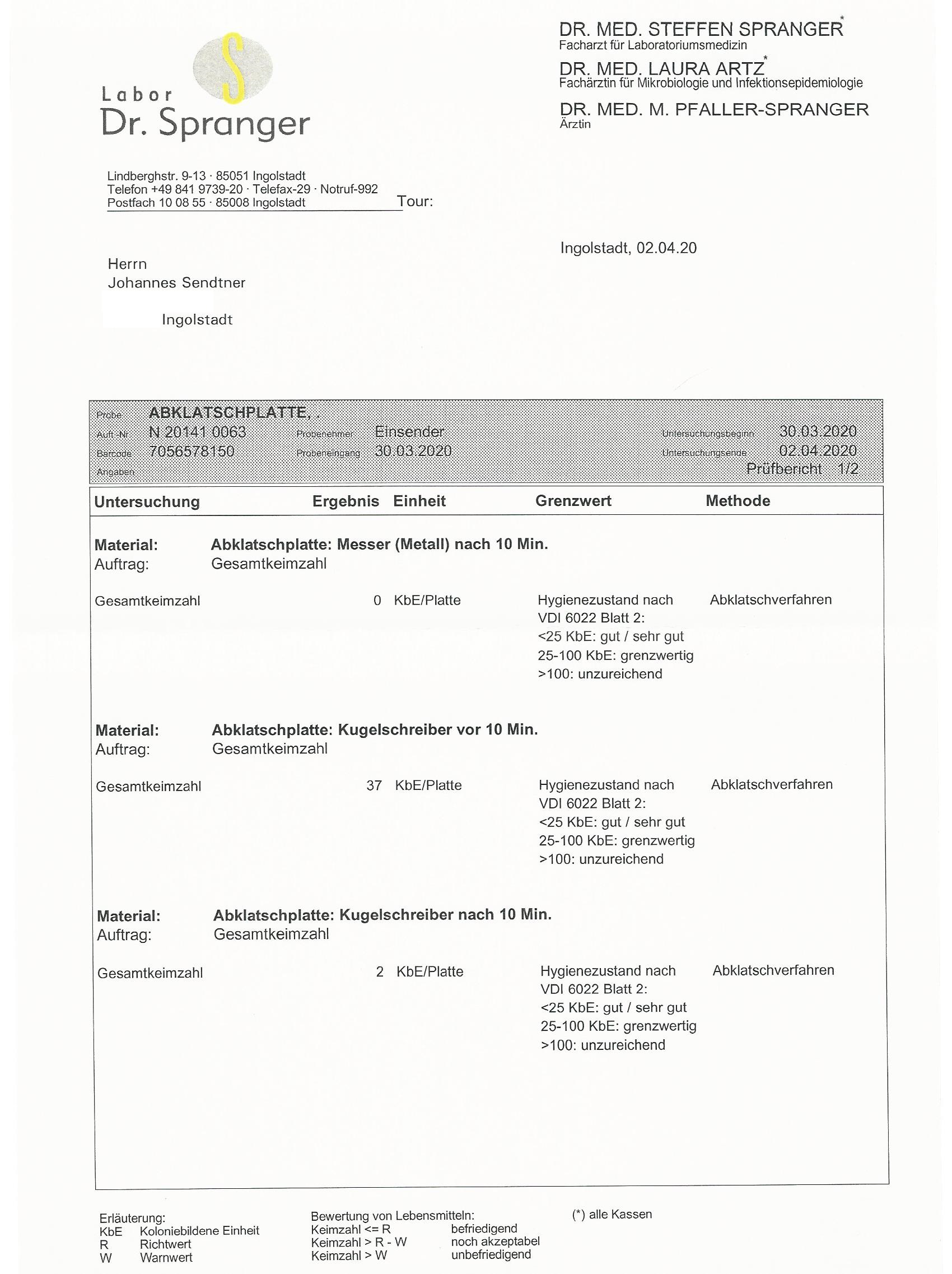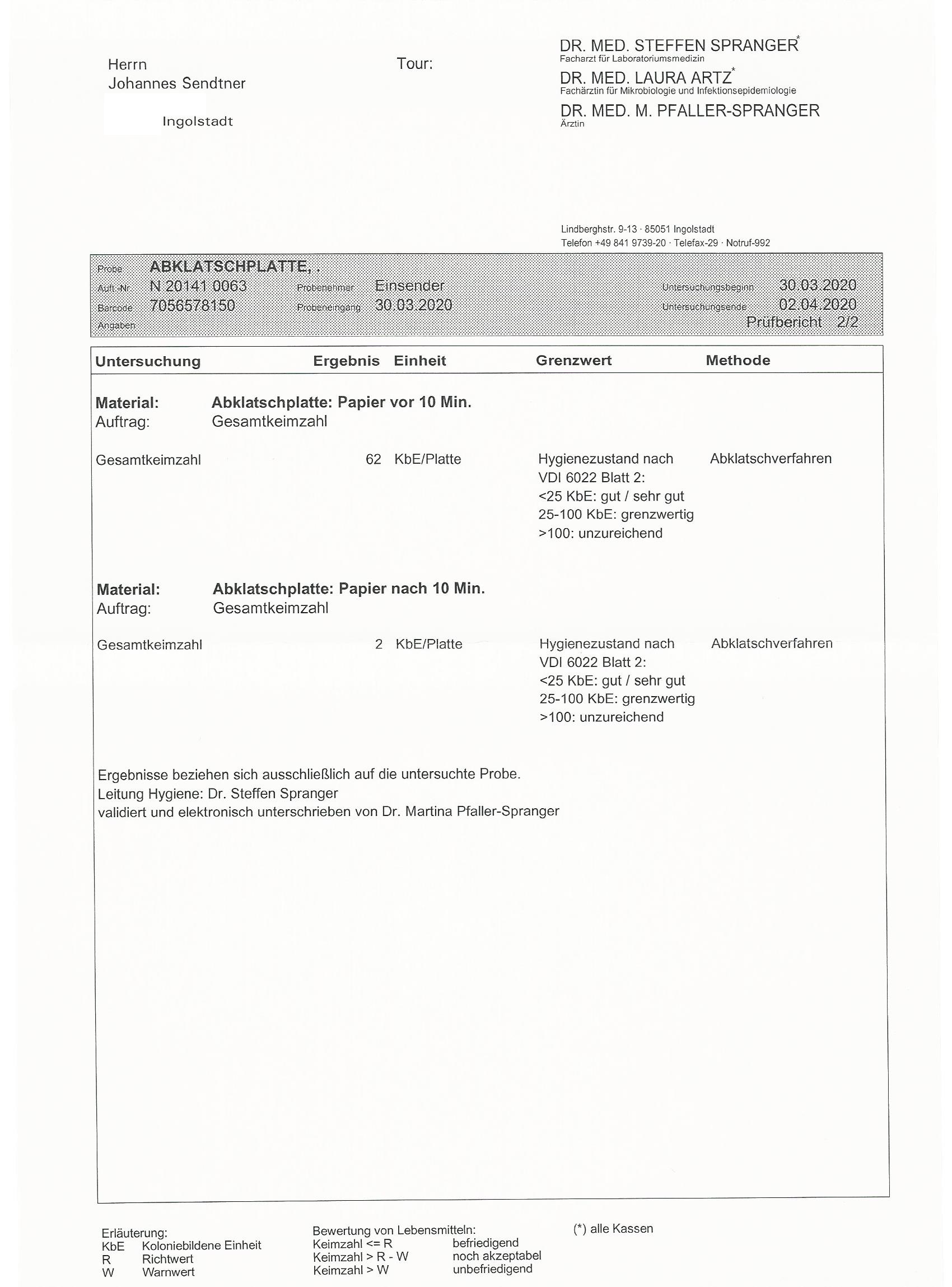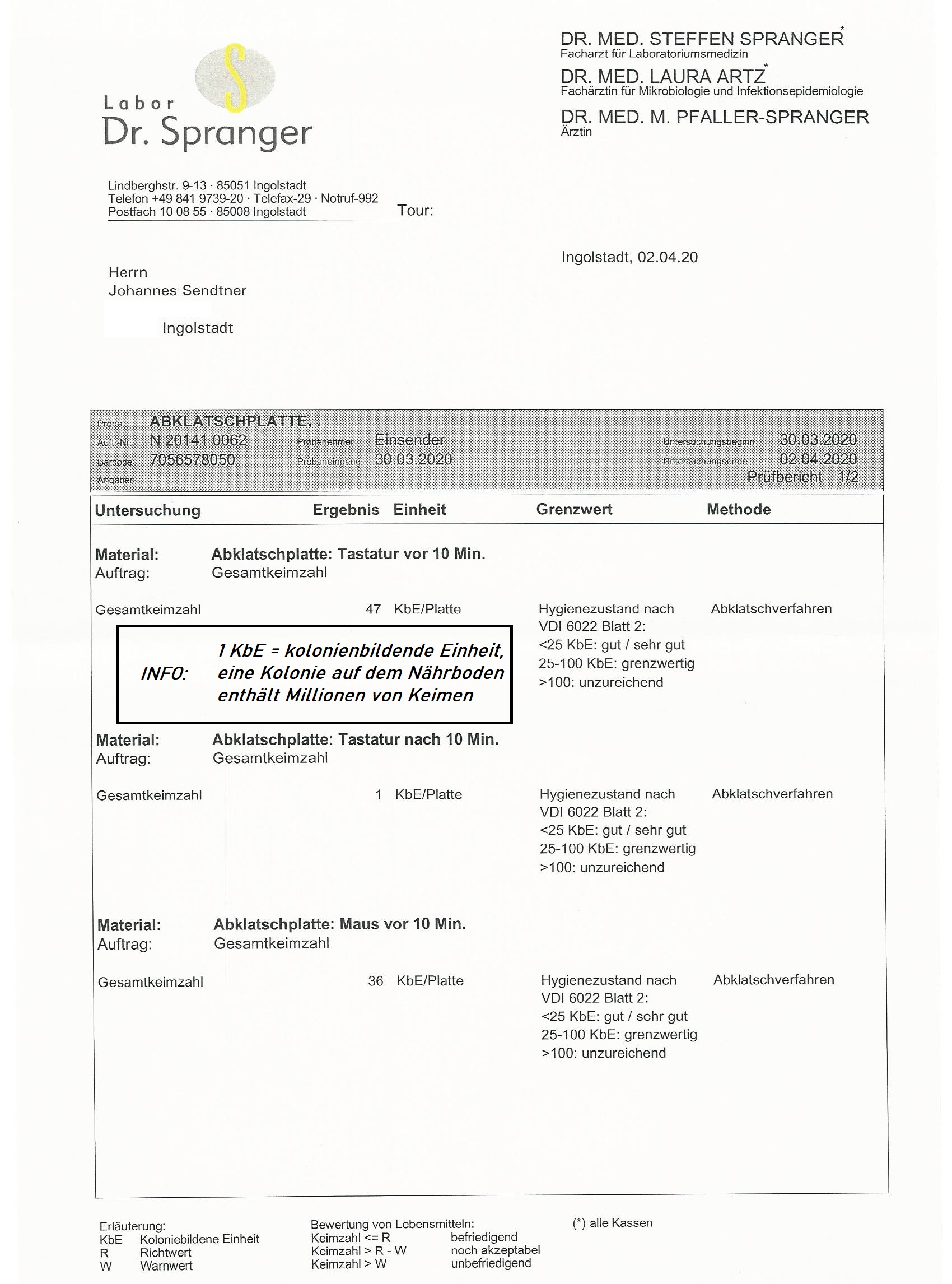 Das Gerät wurde auf Auswirkungen auf die Materialbeschaffenheit der bestrahlten Gegenstände und von einem zertifizierten Hygienelabor auf eine mikrobiologische Wirkung getestet. So wurde sichergestellt, dass die technische Zusammenstellung des Gerätes keine materialschädigende Wirkung besitzt und die Funktion auf mikrobiologischer Ebene ebenfalls gewährleistet ist. Der Prototyp schädigte die getesteten Gegenstände nicht in Ihrer Oberflächen- & Funktionsbeschaffenheit und tötete nachweislich darauf befindliche Keime effektiv (sehr gut) ab (siehe Laborbefund).