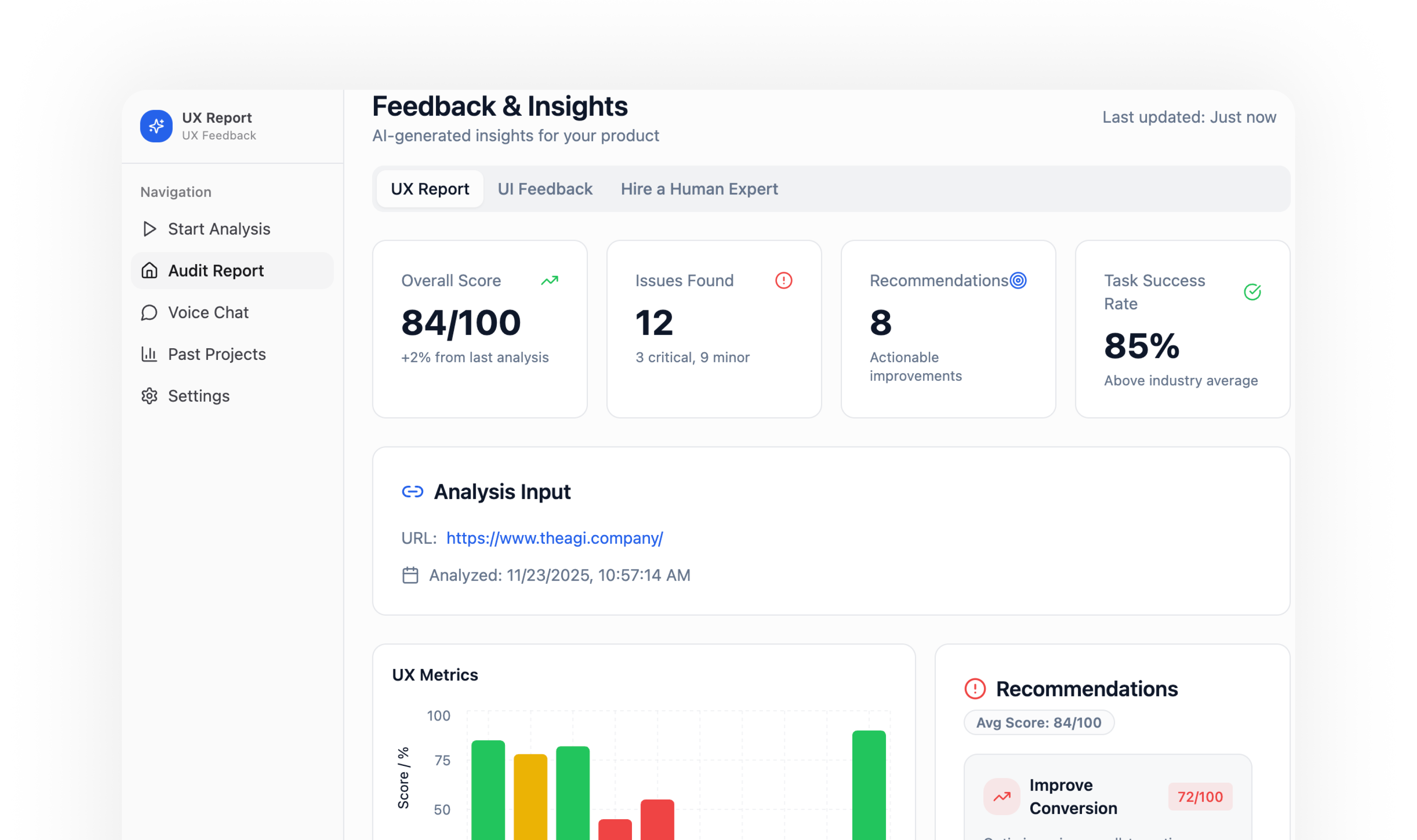 We built an AI-powered UX engine that delivers expert-level audits in seconds, turning a once manual, expensive process into an accessible, scalable experience for every founder. We integrated AGI-driven research, real conversion psychology, and human-in-the-loop support into one seamless product. Most importantly, we created a tool that helps businesses instantly improve clarity, usability, and revenue—democratizing high-quality UX feedback for thousands of users.