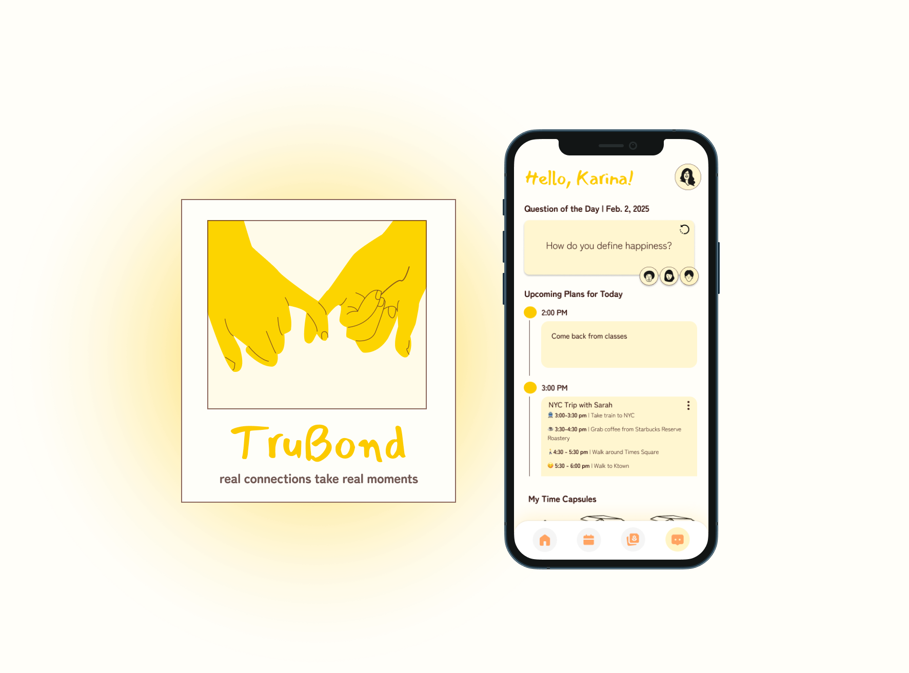 TruBond helps facilitate getting deeper in the relationships that Gen Z have. We provide spaces where friends and others can make memories, experience life together, and cherish those times, strengthening those connections. TruBond encourages people to transition towards a deeper level of connection by engaging in conversations, spending quality time with each other, and sharing memories.