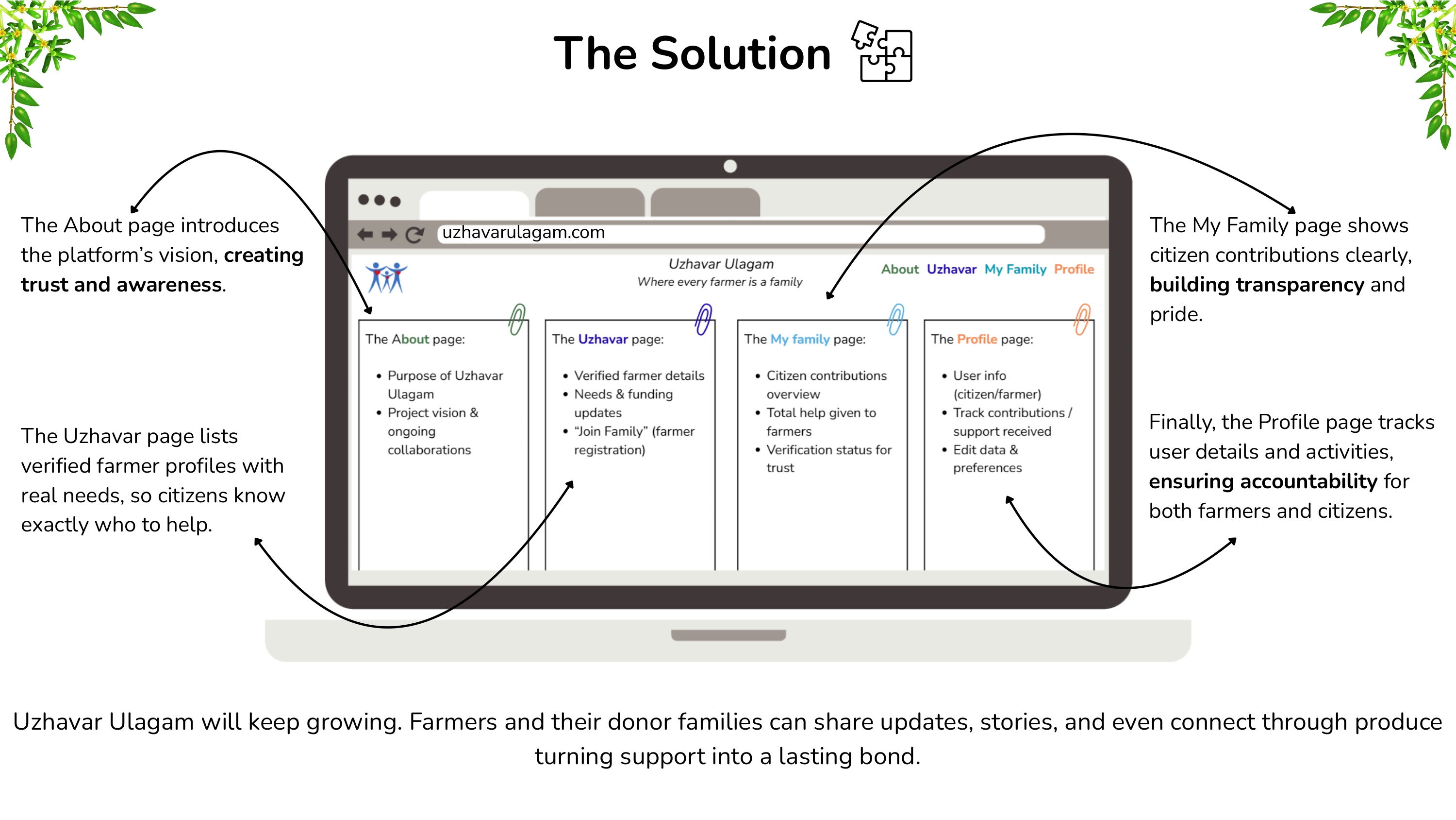 Uzhavar Ulagam is a digital platform that connects farmers and citizens directly. It ensures trust with verified farmer profiles and transparent contributions. Beyond support, it builds long-term bonds and can grow into produce sharing between farmers and their donor families.