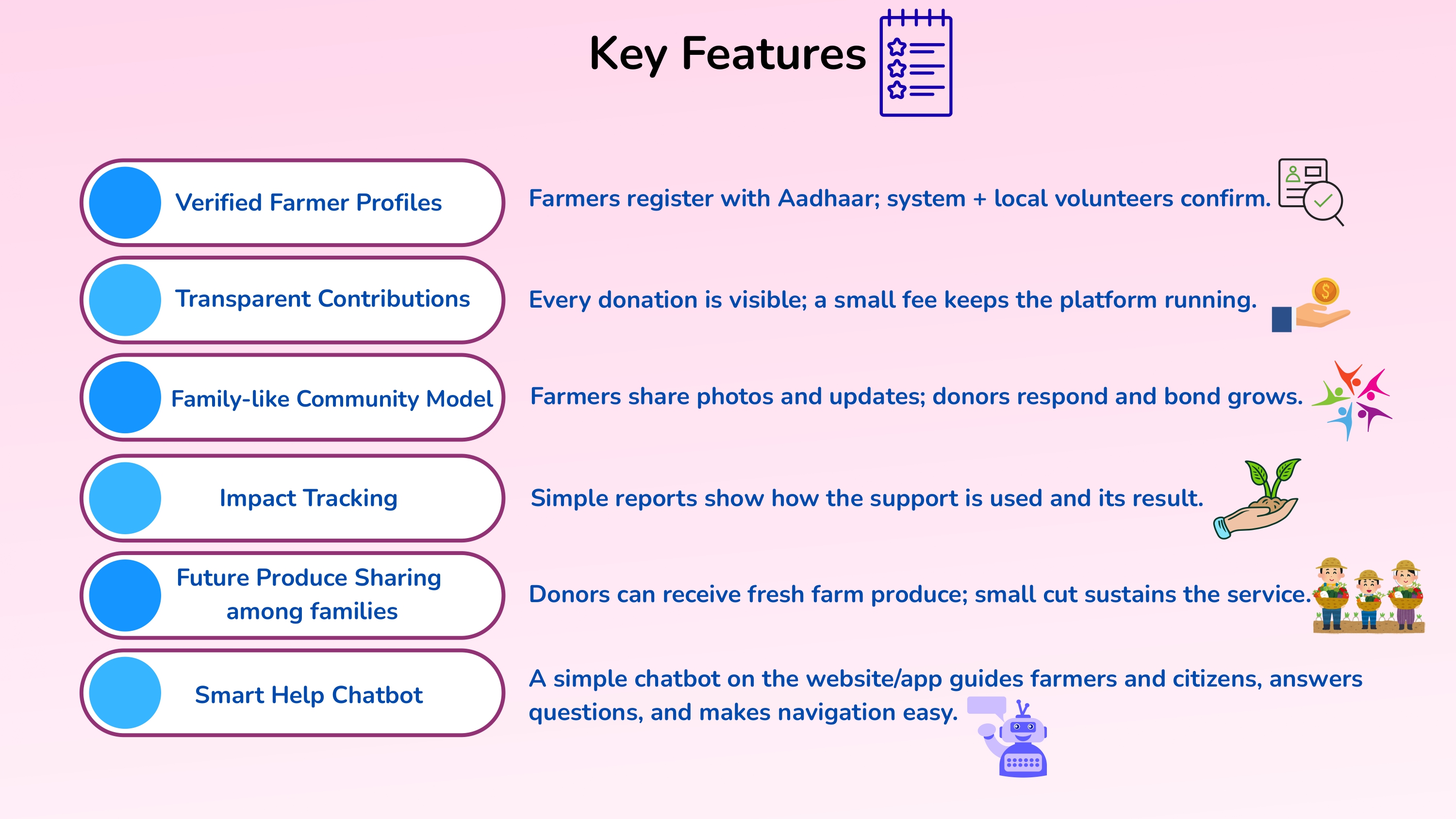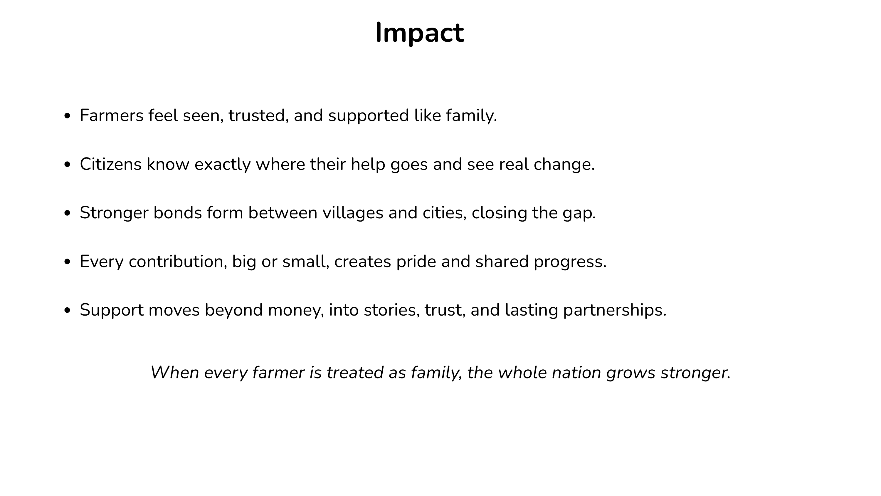 Farmers get direct, timely support without middlemen. Citizens gain trust through clear updates and reports. The system builds lasting bonds where farmers and donors grow together like family.