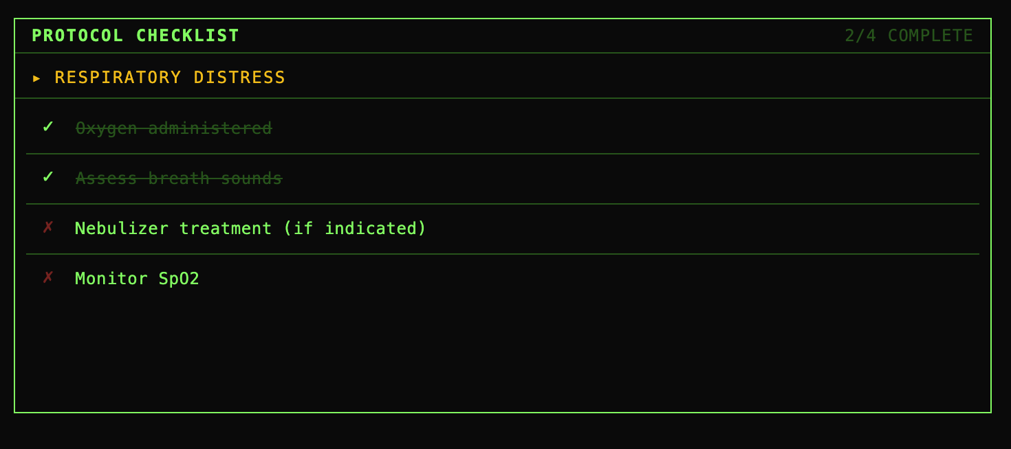 - Auto-detects the medical condition and loads the appropriate EMS protocol checklist (cardiac, stroke, trauma, respiratory)