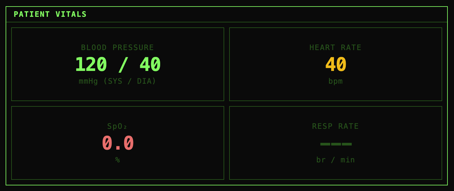 - Displays live vitals with clinical severity coloring