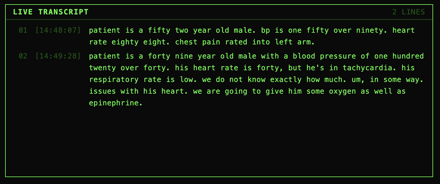 The Live Transcript - This shows the live transcribed audio of whatever the Paramedic is saying