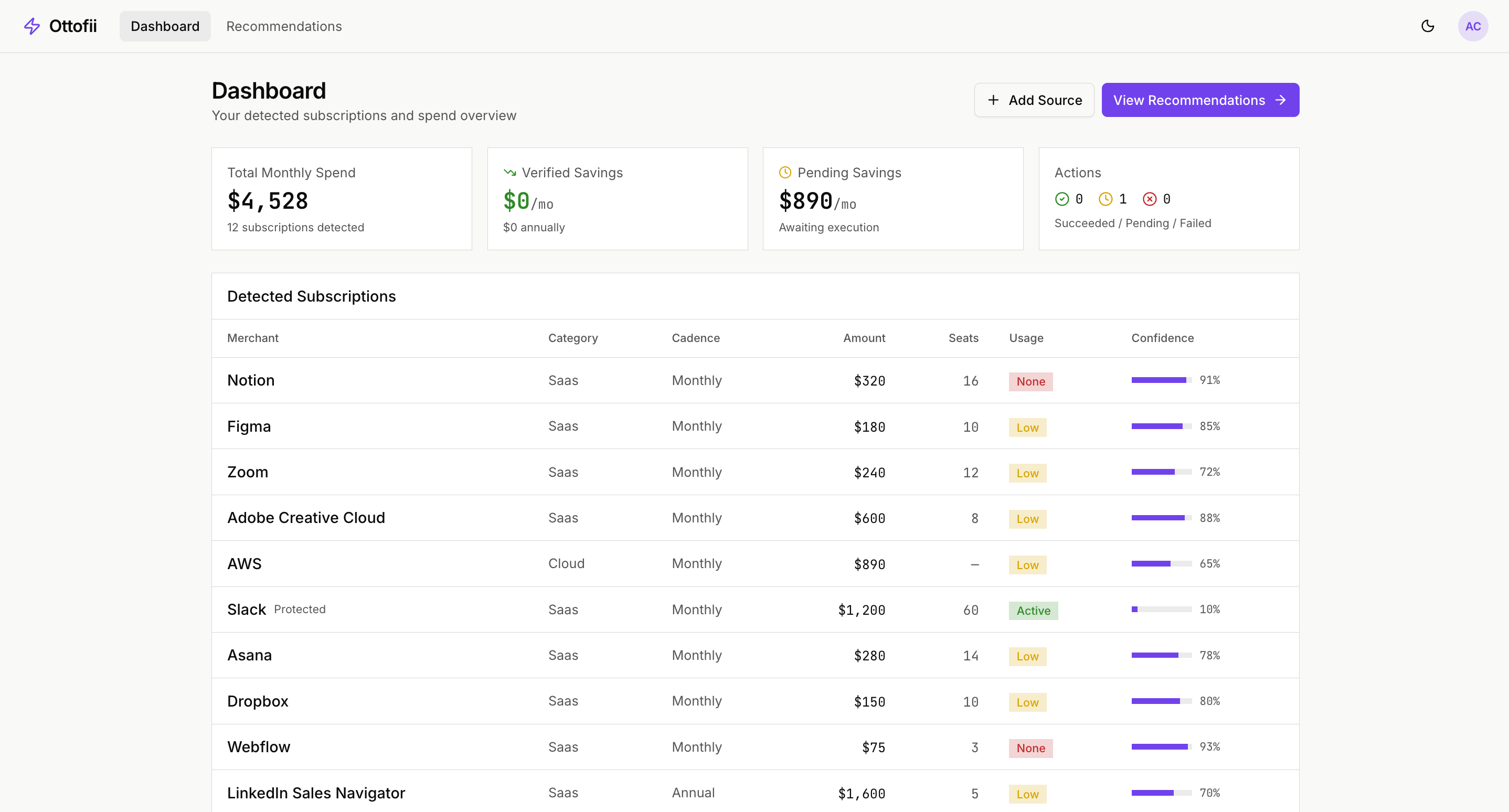 Detect: Ottofii analyzes your financial signals such as bank transactions, email receipts, SaaS usage, and identifies recurring charges using deterministic cadence detection and merchant normalization.