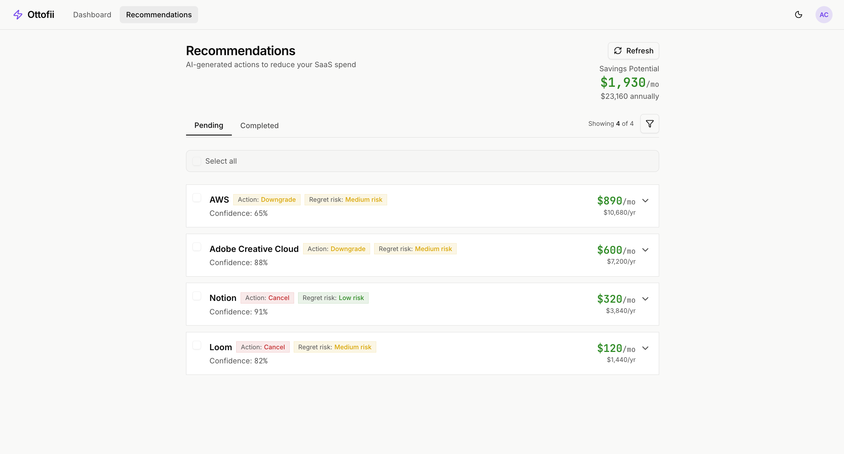 Otto surfaces a prioritized list of actions: cancel underused tools, downgrade oversized plans, or renegotiate contracts