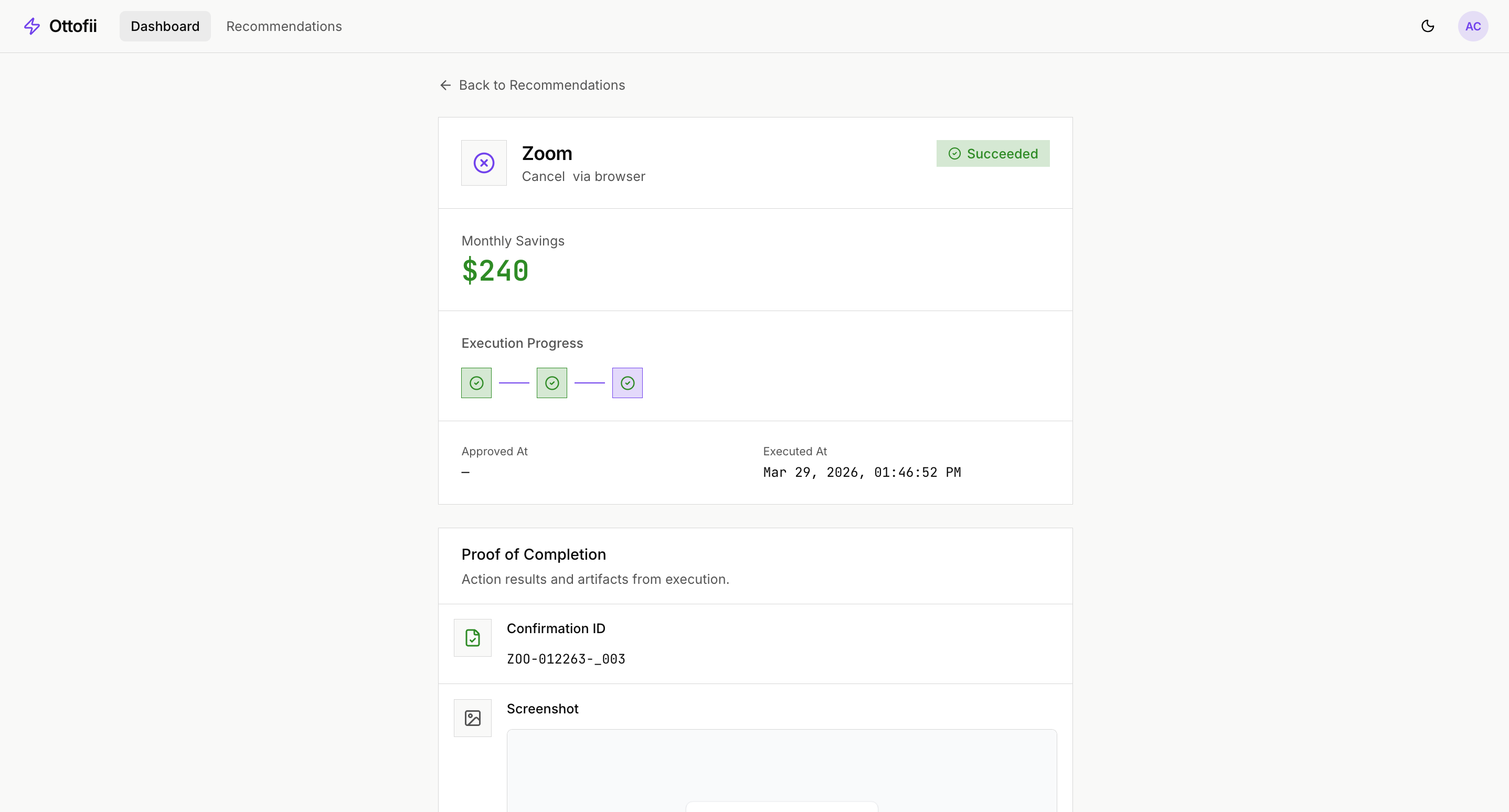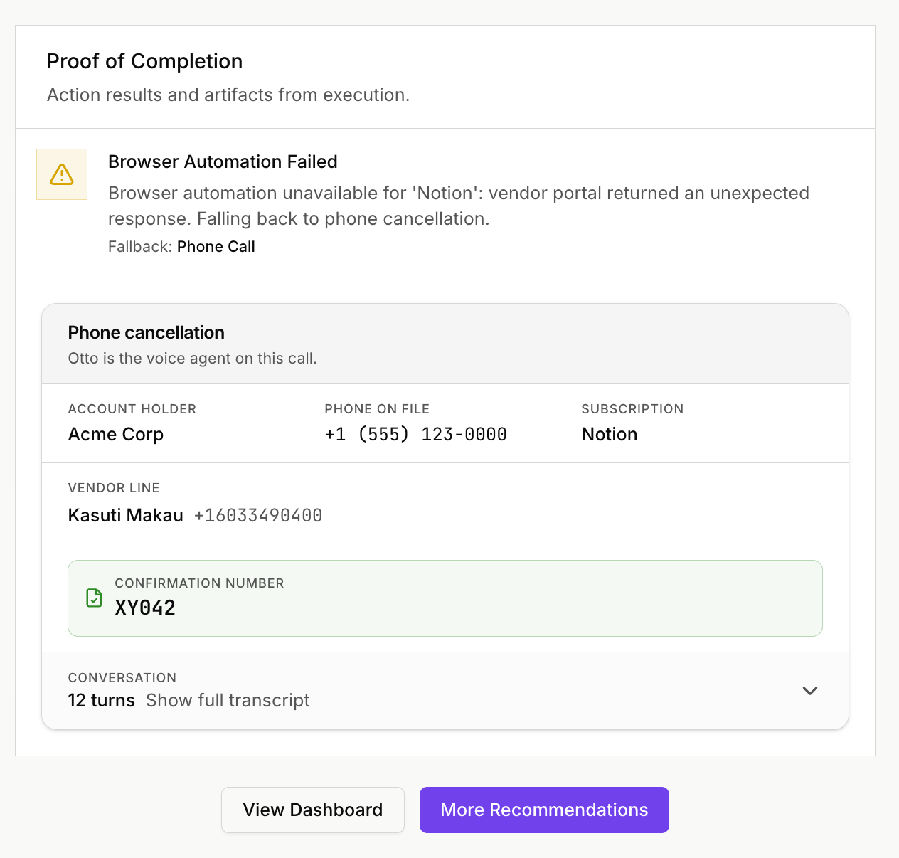 Act: With one click to approve, Ottofii executes the cancellation automatically via multi-channel automation: browser, email, or an AI-powered phone agent (ElevenLabs) that handles retention offers and verification on your behalf.