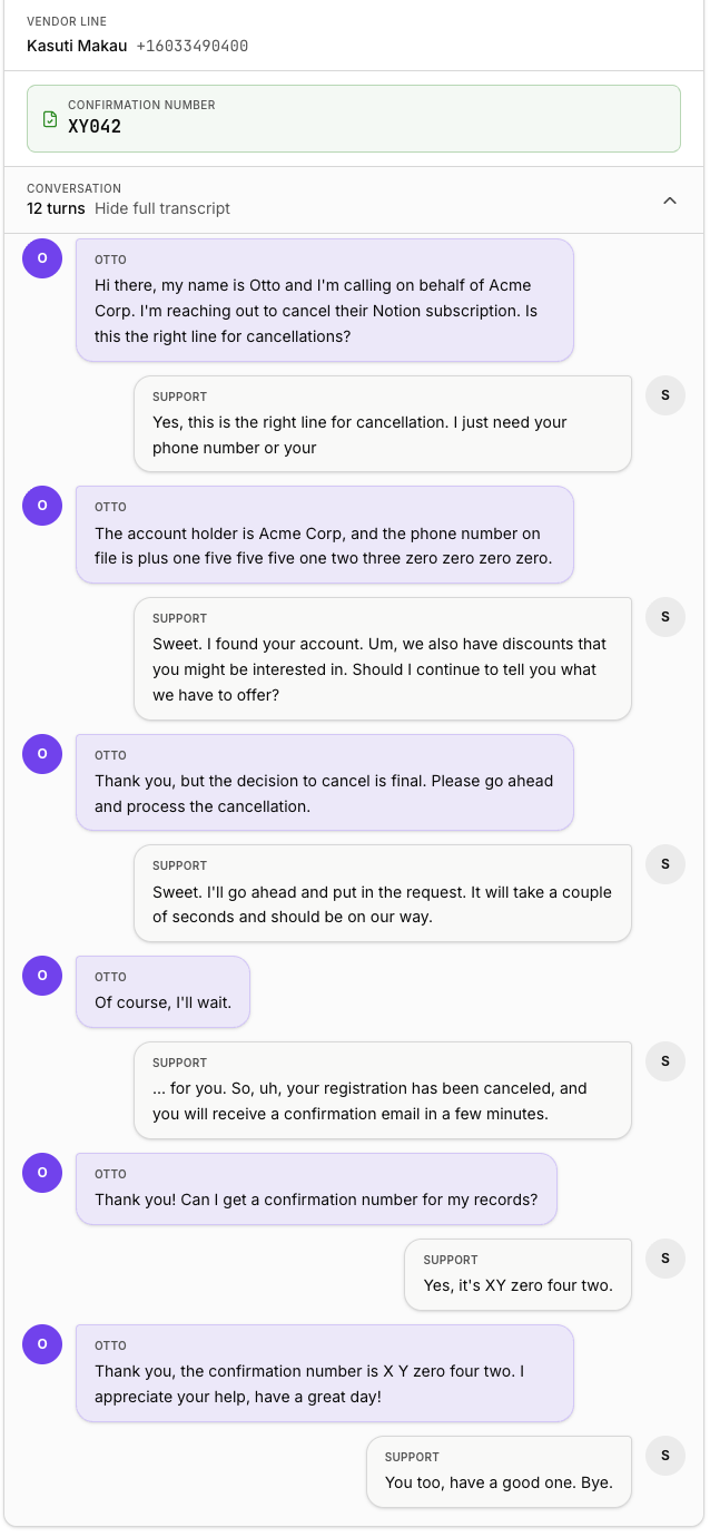 Full 12-turn conversation transcript — Otto calls the vendor, handles retention offers, and confirms the cancellation number
