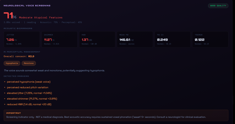The hardest part was making the neurological voice screening clinically meaningful rather than just a number. Implementing jitter, shimmer, HNR, and tremor from scratch required F0 tracking with parabolic interpolation and octave-error filtering, plus calibration against published clinical thresholds so the output actually meant something. Browser audio was another battle: MediaRecorder silently failed across different browsers and codecs, so we had to bypass it entirely and capture raw PCM from the AudioContext ourselves. We also had to gate the scoring behind data-quality checks, because Gemini will confidently analyze 0.3 seconds of silence, and a real clinical tool cannot.