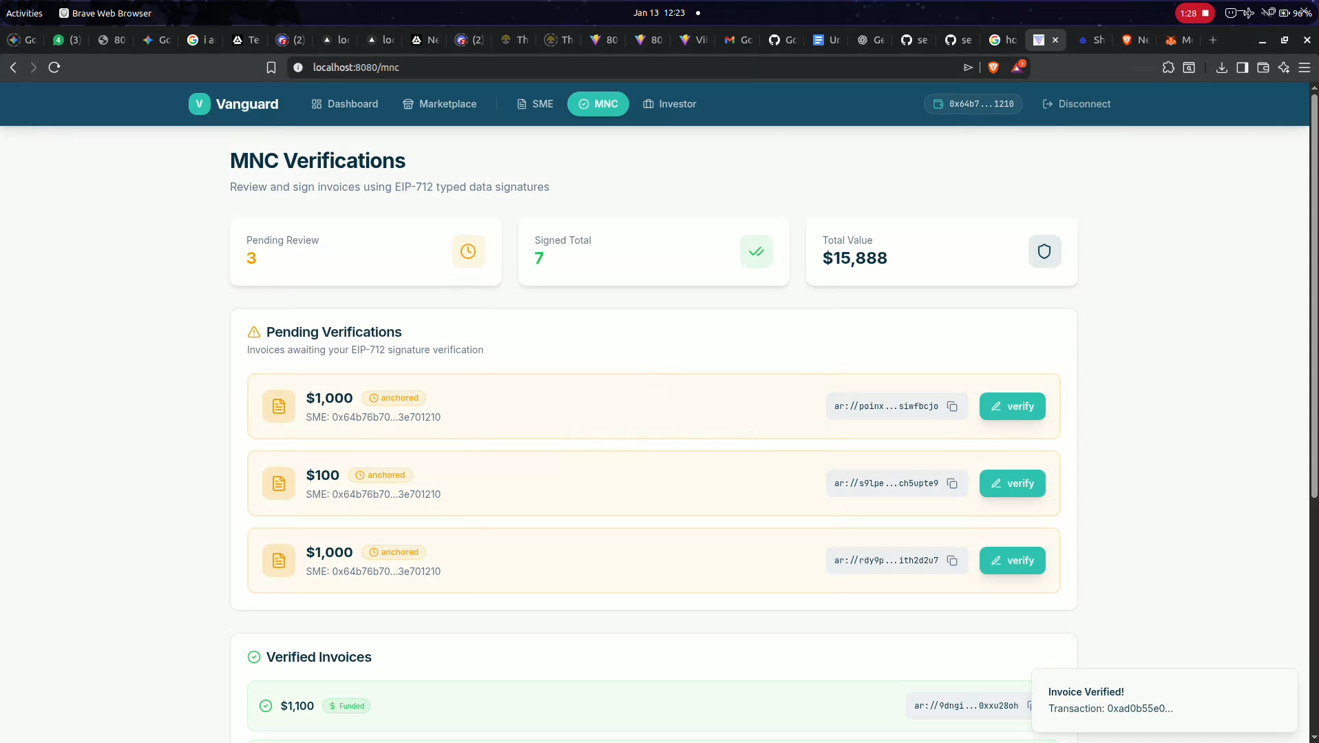 - On-Chain Verification: Successfully implementing a zero-trust model where an SME cannot mint a debt NFT unless the MNC’s signature is verified by the smart contract.