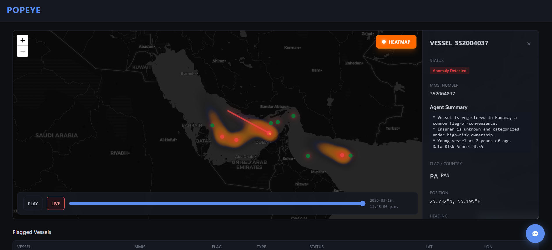 Popeye is a maritime intelligence dashboard that tracks vessels and highlights suspicious activity associated with shadow fleets.