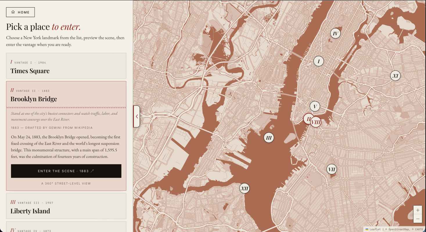 We scraped data from a map then gathered information through Gemini to get the scene and key details, then used Nano Banana to create the panorama, then generate hotspot vision for labeling with Gemini vision + bbox detection, then generate summaries by scraping Wikipedia and verifying with Gemini and finally we render the info-panels for VR with text-to-speech