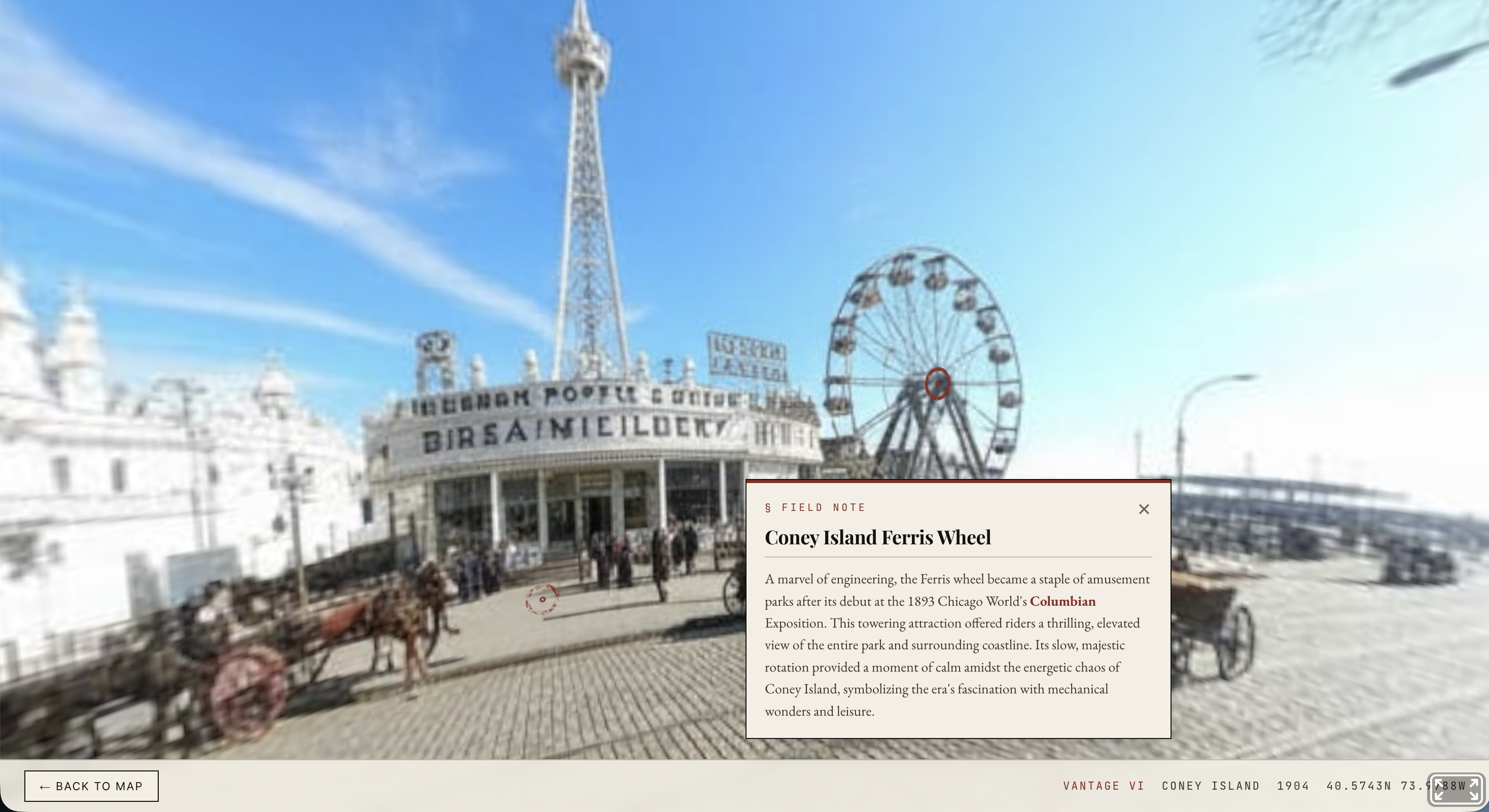 Vantage is a dynamic website that enables users to choose a point to see significant historical events and a 360 image that you can look around in using VR or clicking and dragging via mouse input.