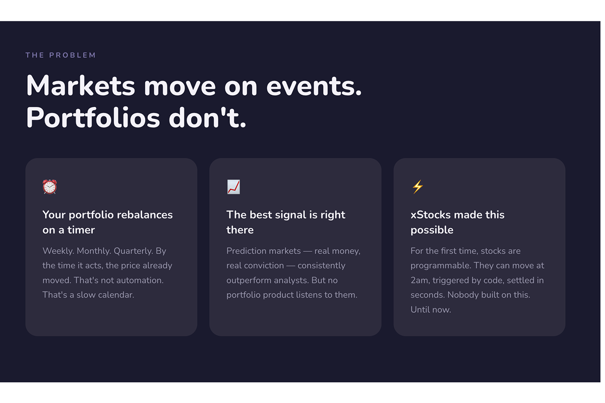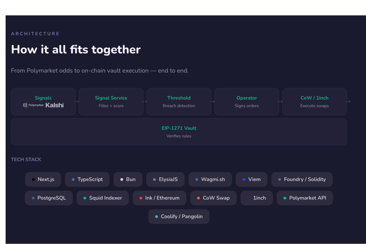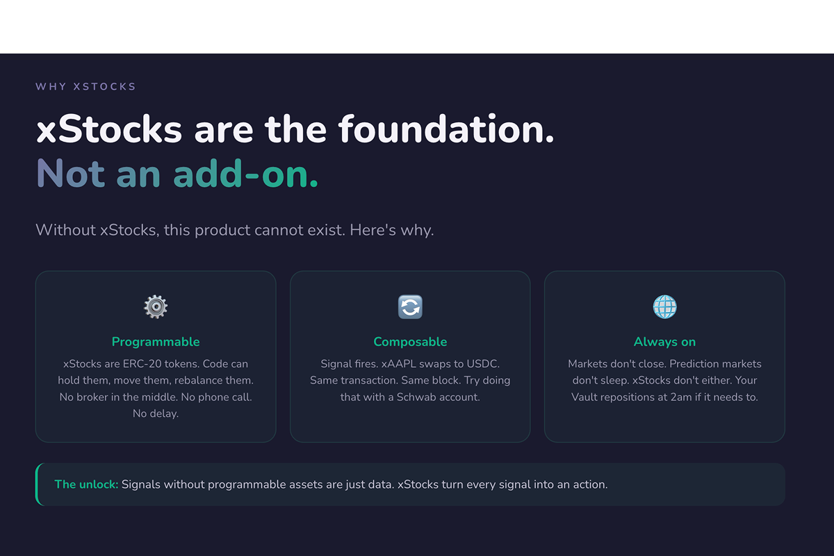 The missing piece was intelligence. A vault that just rebalances on a timer is a robo-advisor clone. But Polymarket, where participants put real money behind their predictions, provides a live, incentive-aligned signal layer that consistently outperforms analyst consensus. We asked: what if onchain vaults holding xStocks could listen to prediction market odds and reposition automatically, before the price moves?