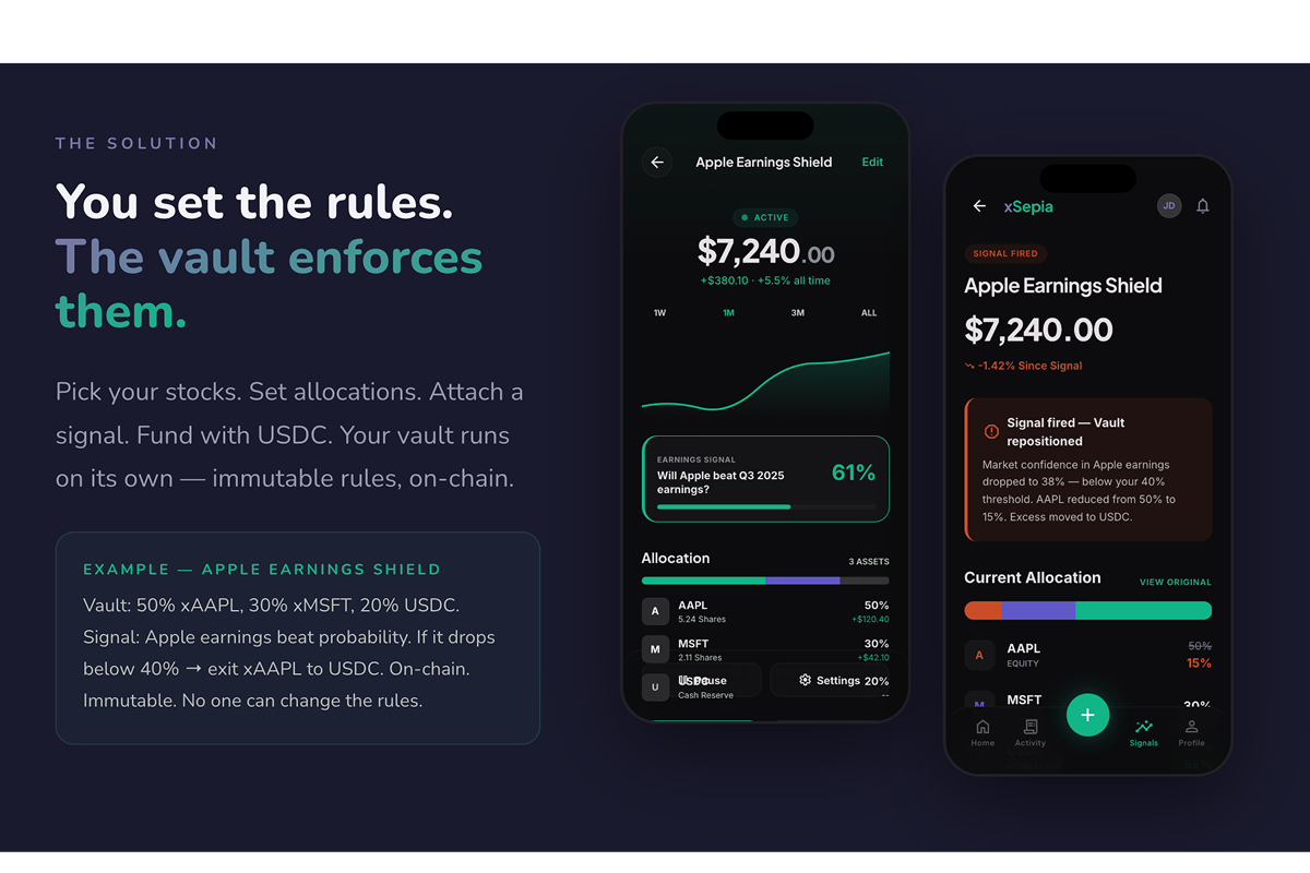 xStocks as the asset layer. Every vault in xSepia holds xStocks tokenized equities as its core assets. When a user defines an allocation like 50% AAPL / 30% MSFT / 20% USDC, the vault calls xStocks' buy action to acquire tokenized stock positions. When a signal triggers a rebalance, the vault sells xStocks back through the same protocol. xStocks are not an add-on; they are the only equity asset type the system supports. Without xStocks, there is no product.