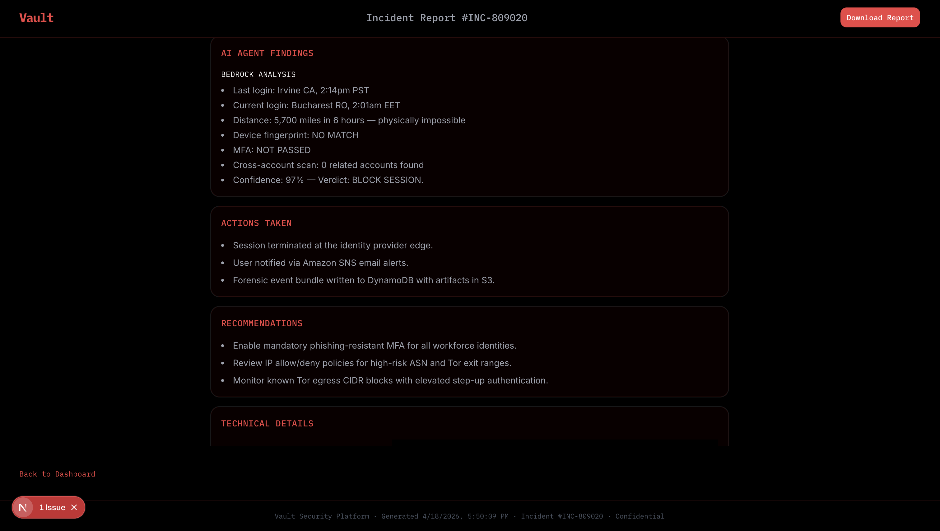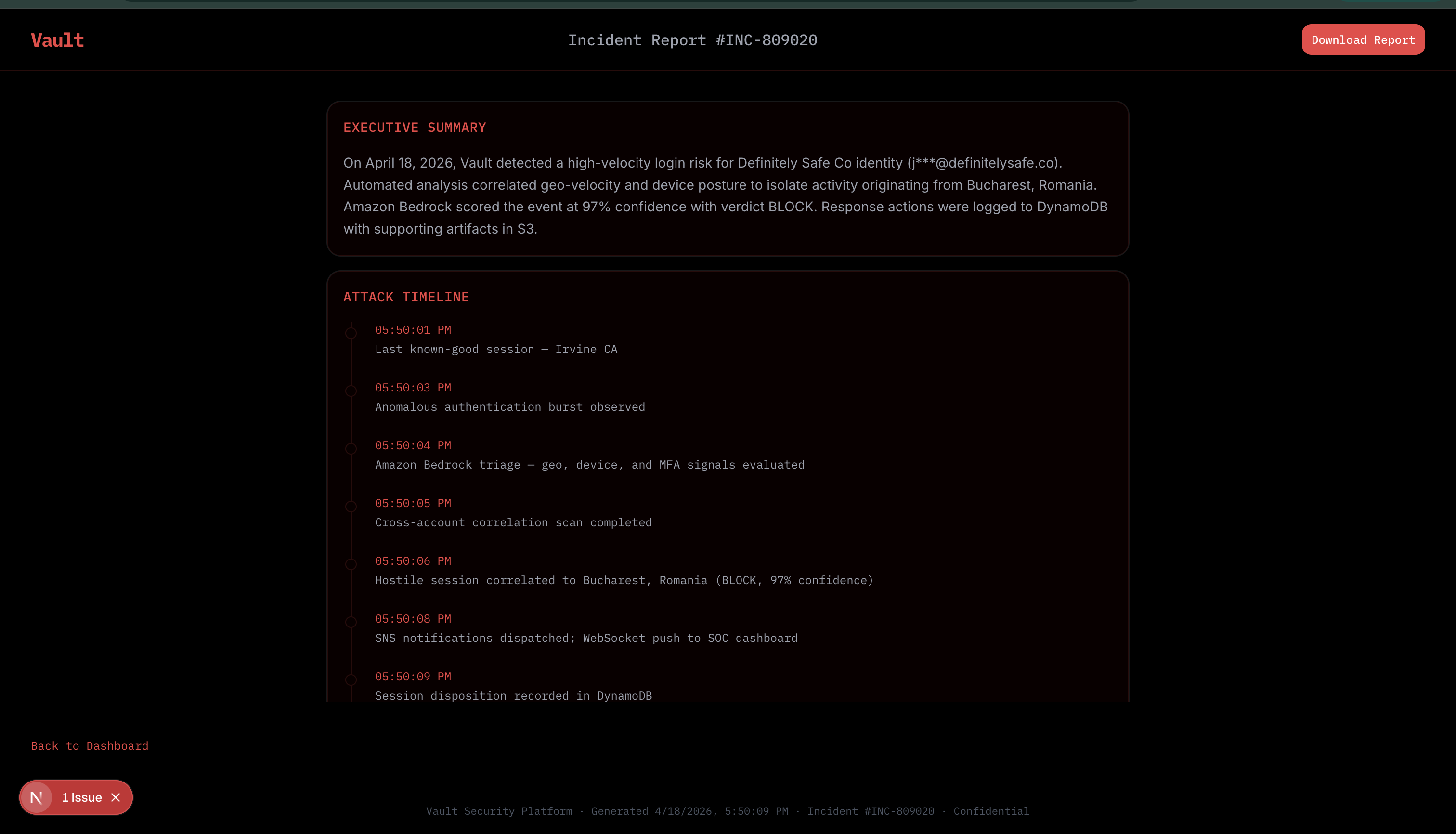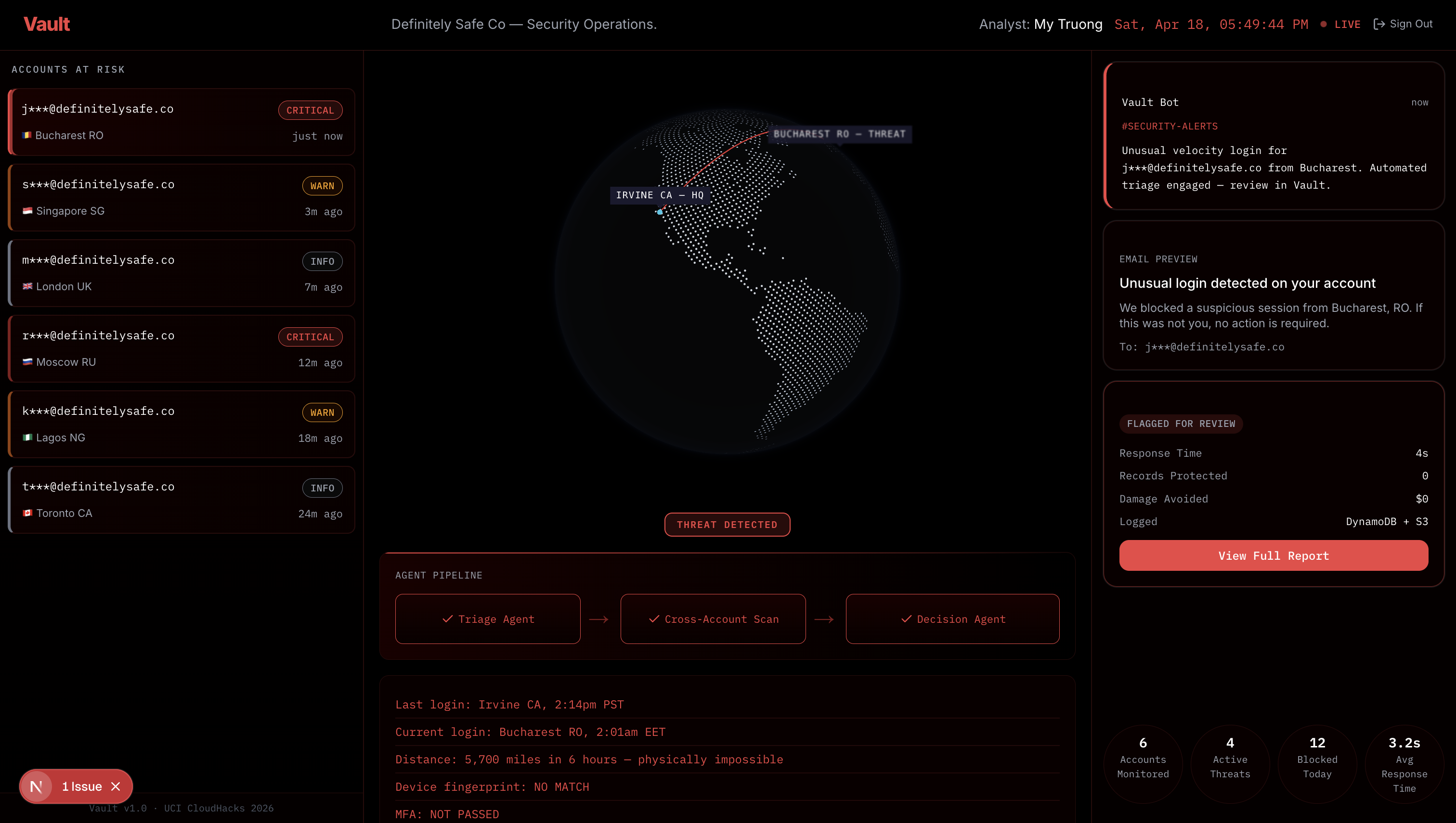 Vault is an autonomous account security platform. When a suspicious login hits an account, an AI agent built on Amazon Bedrock analyzes the location, device fingerprint, IP reputation, MFA status, time of day, and login attempt count — then responds in 4 seconds.