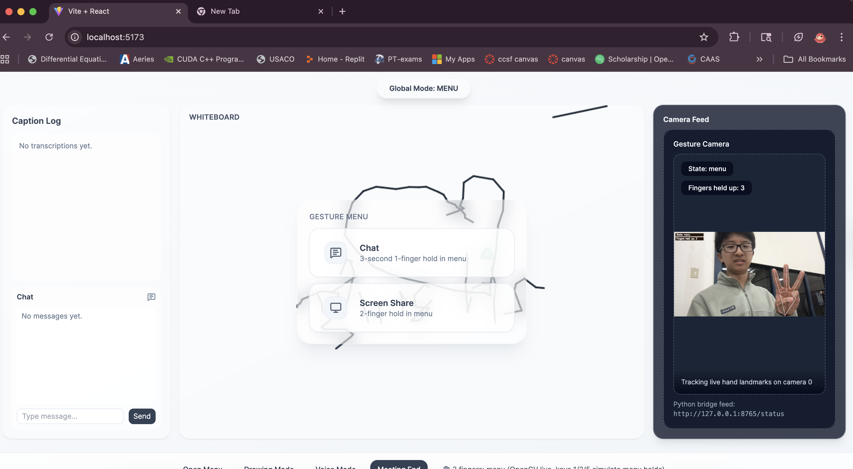 CVBoard is a touchless, collaborative workspace that turns your camera into a controller. Intuitive Drawing: A "one-finger" gesture activates Drawing Mode, allowing users to sketch ideas on a collaborative whiteboard. Open palm to stop drawing. Voice Chat: A “two-finger” gesture opens up voice chat, allowing for voice translation and transcription in the ui. Additional Features: By holding up a “three-finger” gesture, you open a menu, allowing you to manually type in chat or share your screen. Open palm to close the menu.