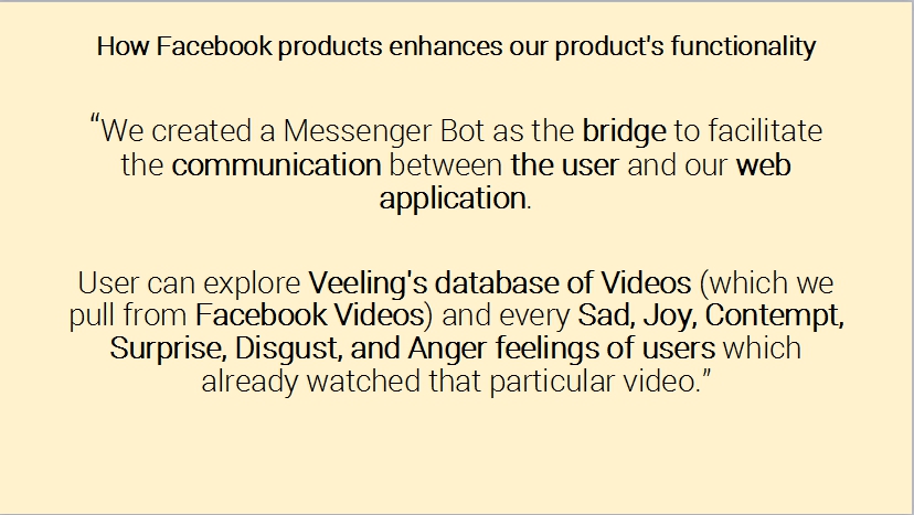 We were inspired by Facebook’s way to collect user feelings on every post by using a new way of ‘Like’, so we were thinking of creating a automatic feelings response on Facebook Video, without any written input from the user.