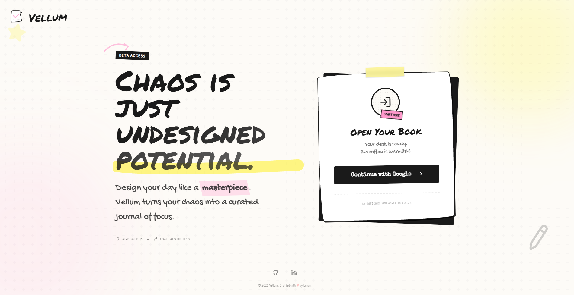 The name “Vellum” refers to a smooth writing surface historically used for important manuscripts symbolizing clarity, intention, and the idea of giving your thoughts a clean, structured space to take shape.