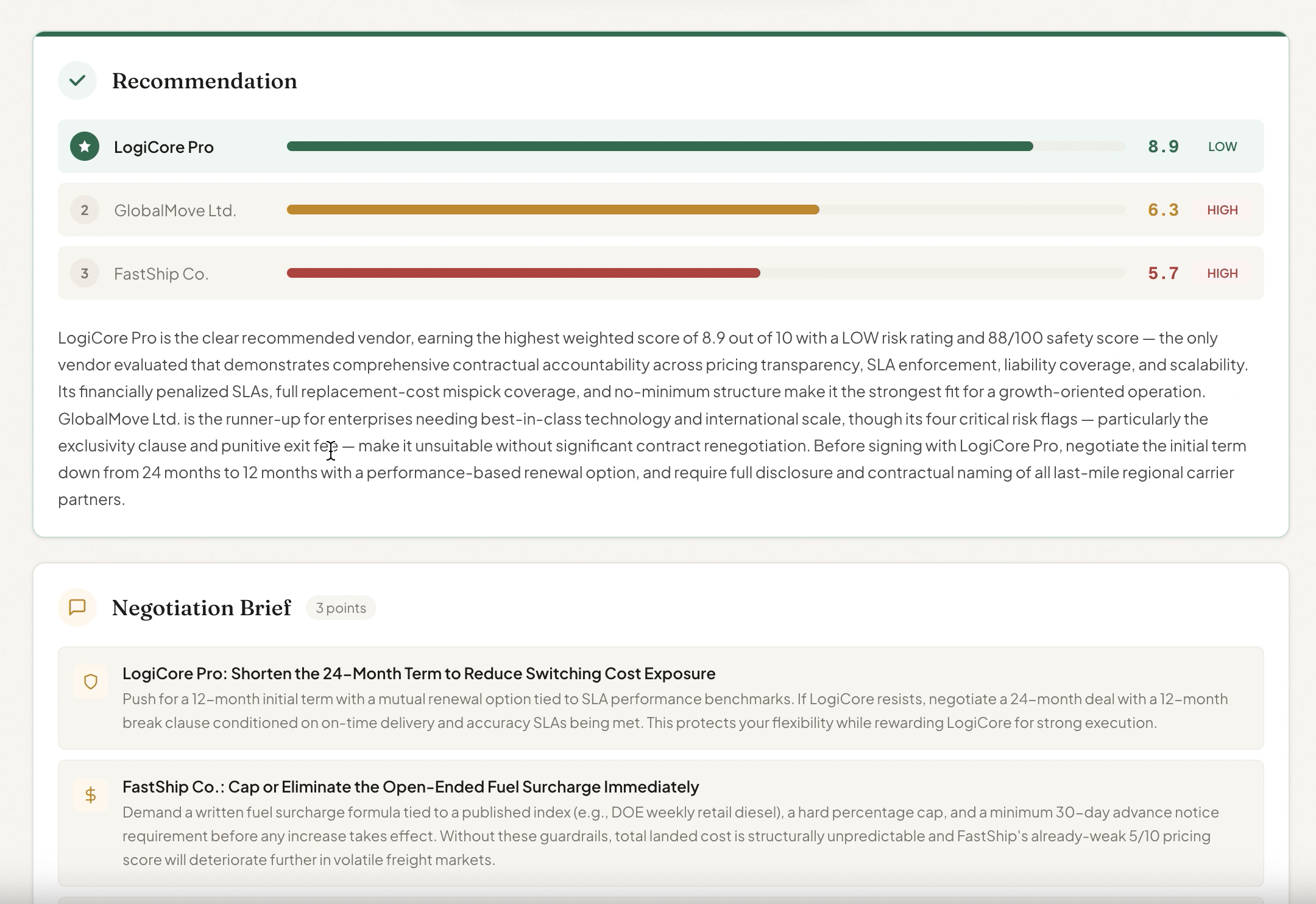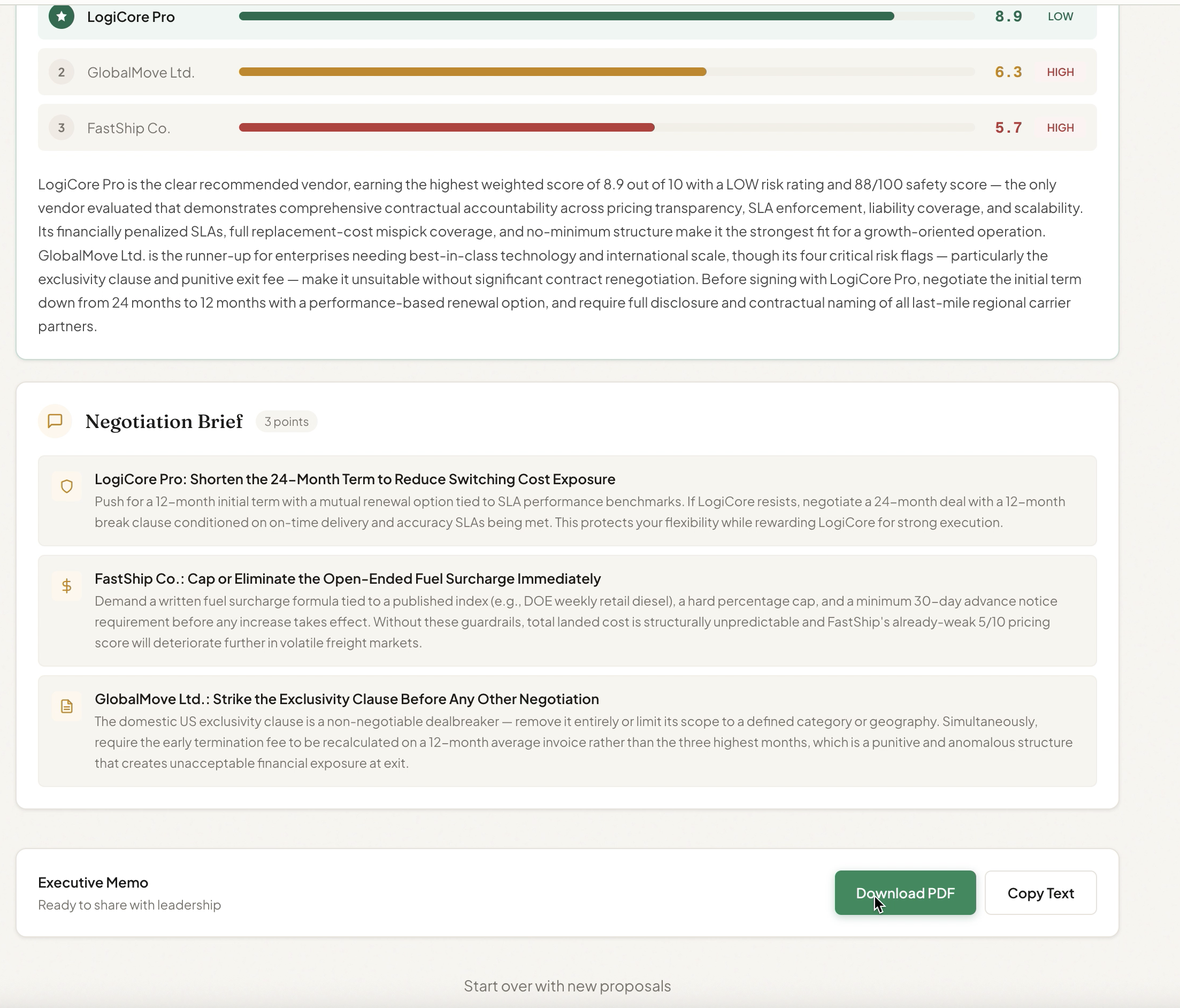 - The PDF export looks like a consulting deliverable. Branded header, color-coded score table with inline bars, risk severity badges, structured negotiation points. A procurement manager could forward this PDF to their VP today.
