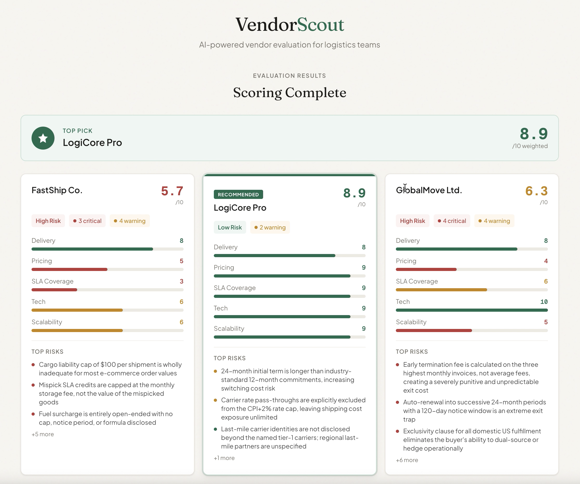 Upload 2--3 vendor proposal PDFs. In 30 seconds, VendorScout delivers: