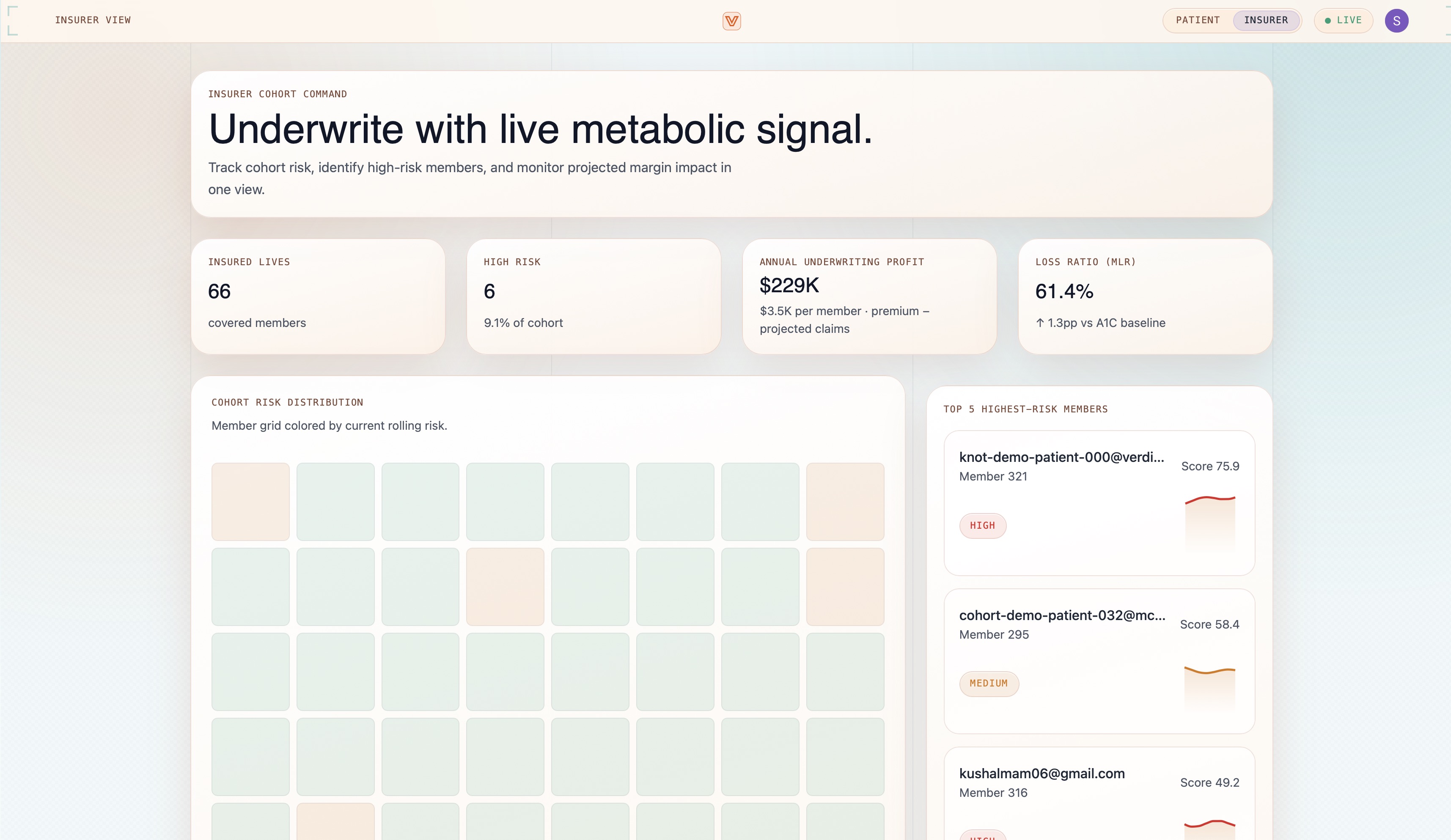 Verdia tracks verified food purchases via the Knot API, scores each meal using K2 Think V2 + Tavily Agents and analyze photos using Gemma 4 31B, and computes a 7 day rolling metabolic risk score. That score directly adjusts the patient's insurance premium in real time. Patients see their score on a personal dashboard. Insurers see a live cohort heatmap ranked by risk.