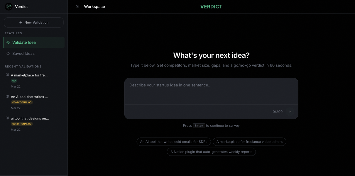 Verdict validates startup ideas in 60 seconds using live web intelligence.