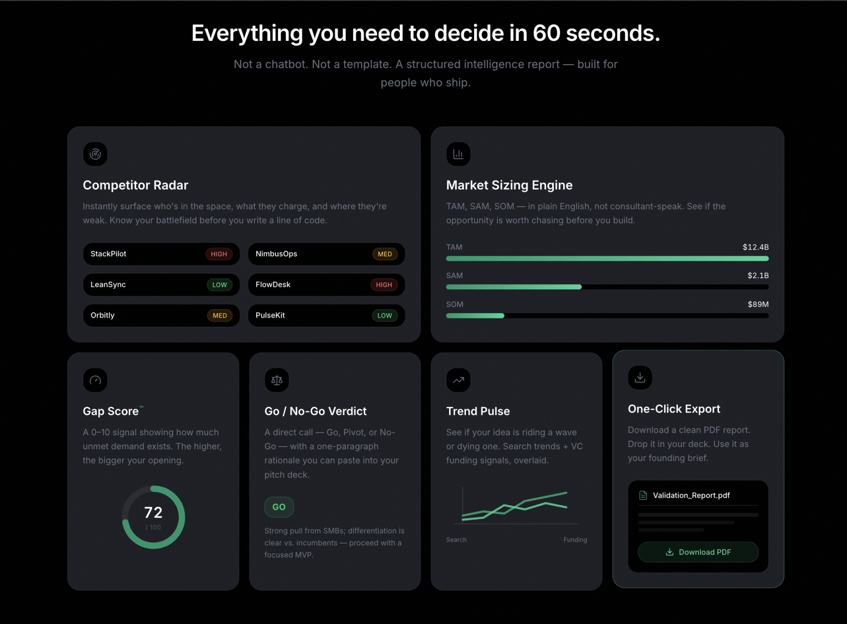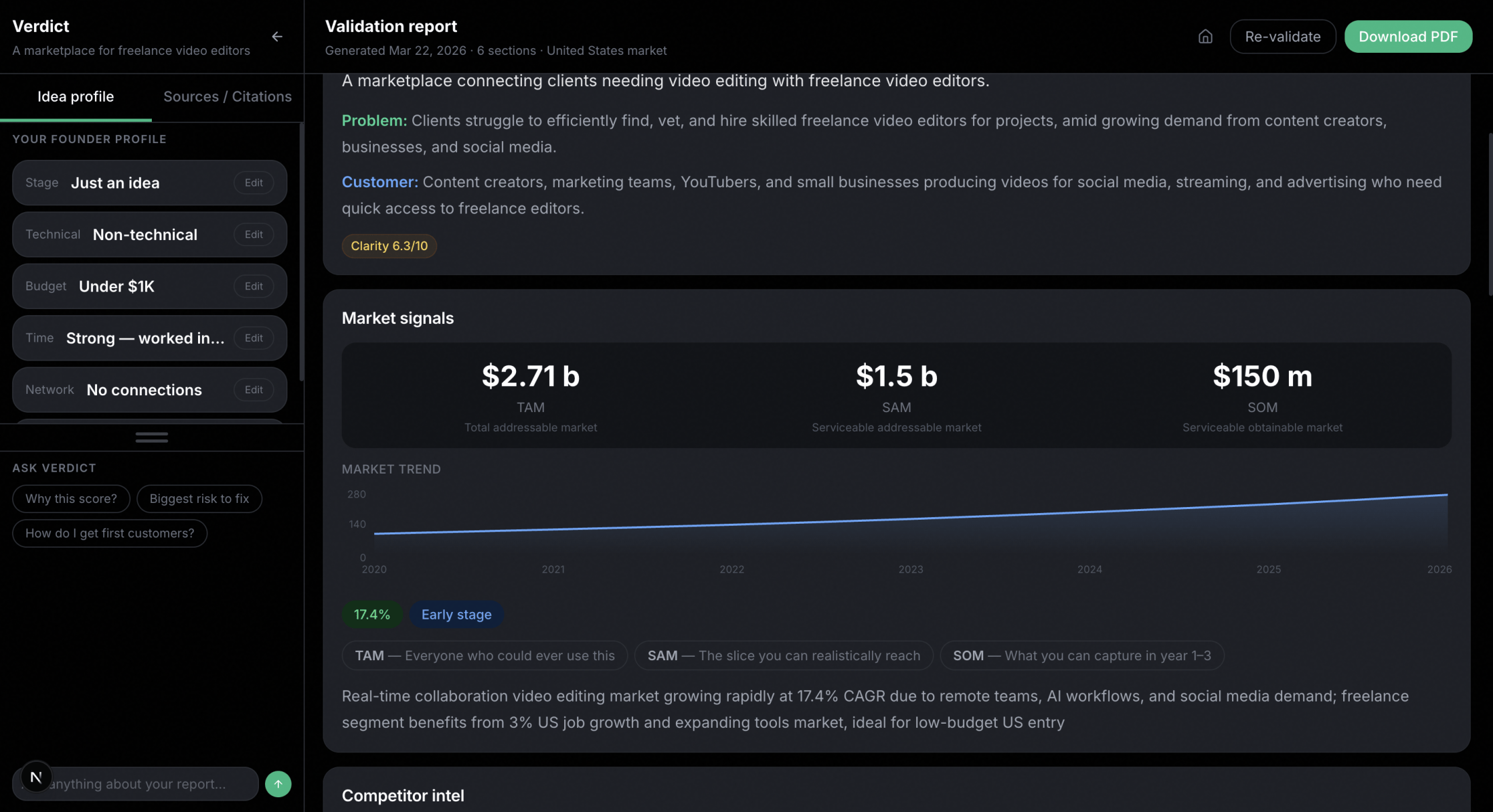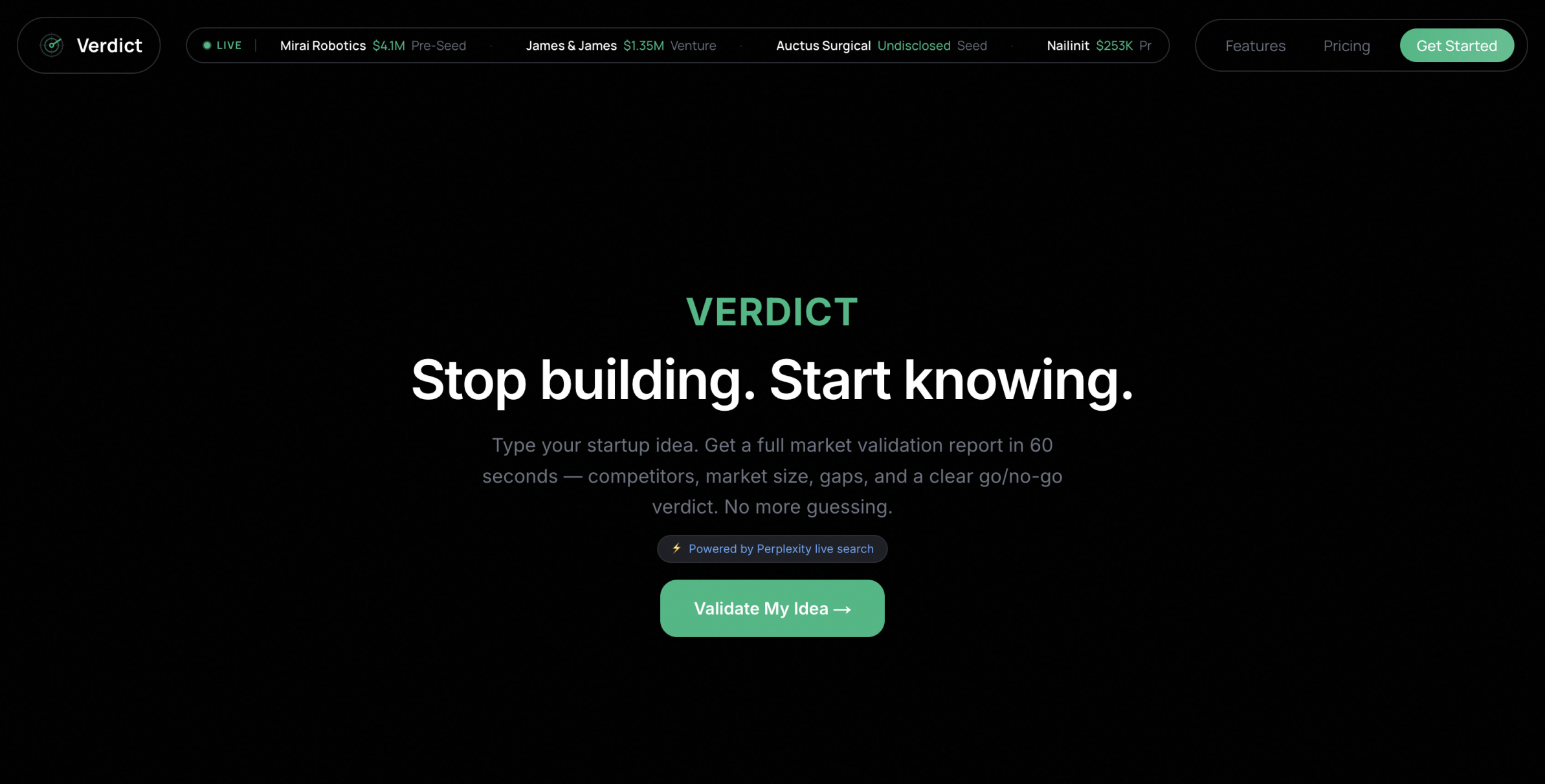 That's the frustration that built Verdict. We wanted something that would just tell us the truth — the way a sharp investor would in the first 10 minutes of a pitch. Live market data. Real competitors. An honest score. Not vibes, not encouragement — a verdict.