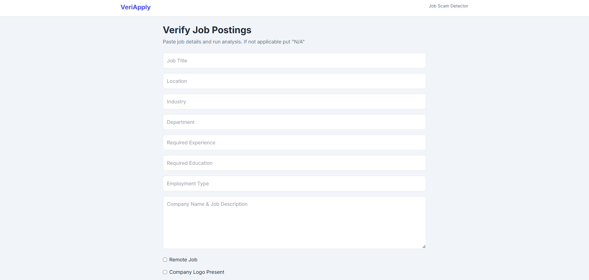 VeriApply is an AI-powered web app that analyzes job postings and predicts whether they are legitimate or potentially fraudulent. It also explains why a job was flagged using interpretable machine learning, highlighting key risk signals such as vague descriptions, missing company information, or suspicious job patterns.