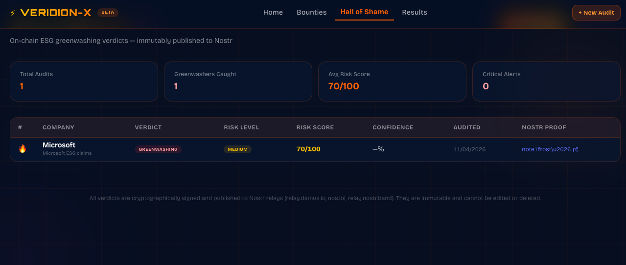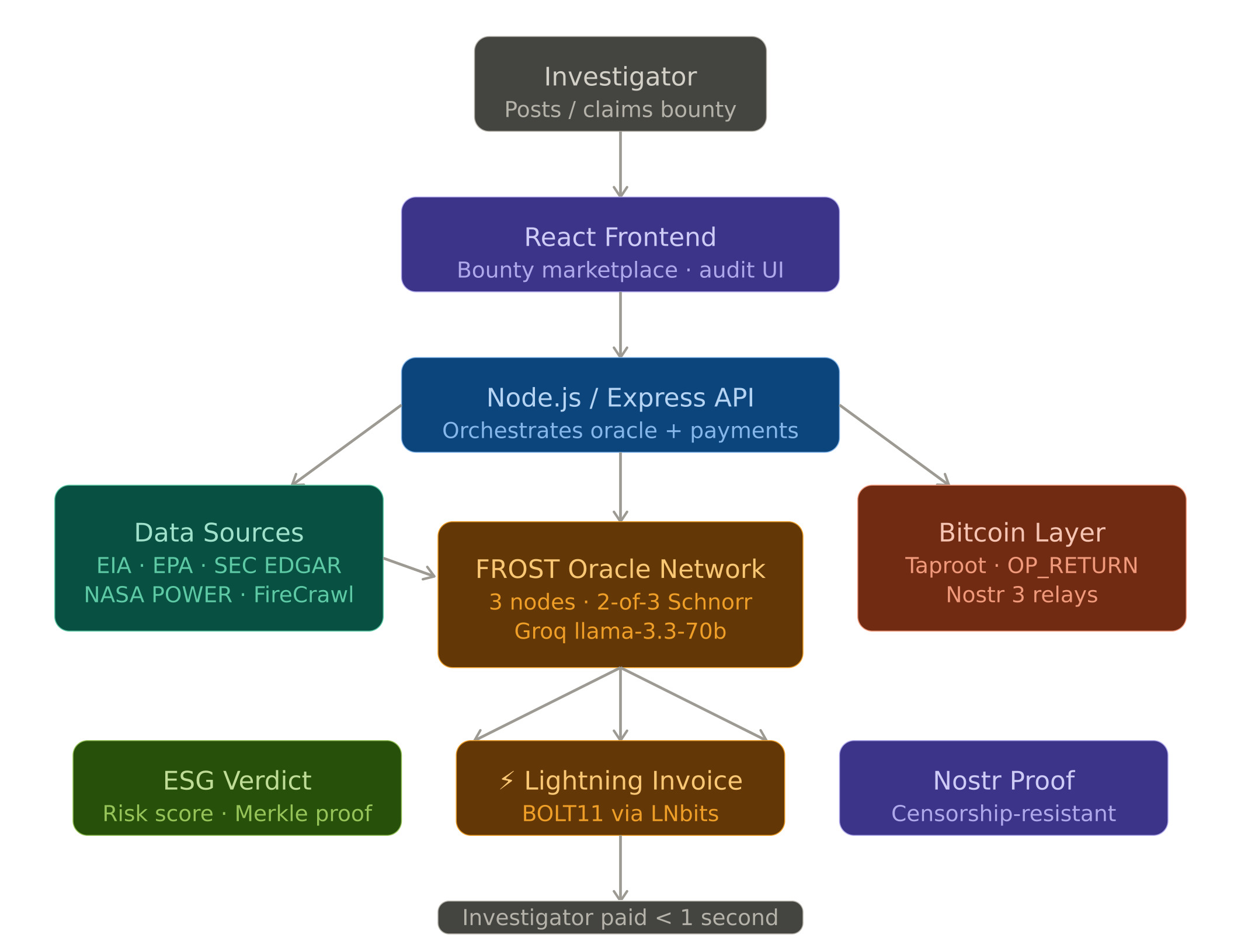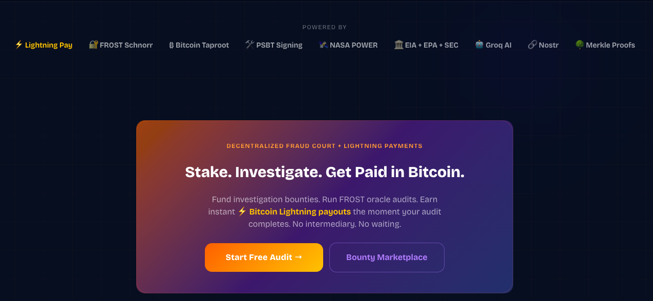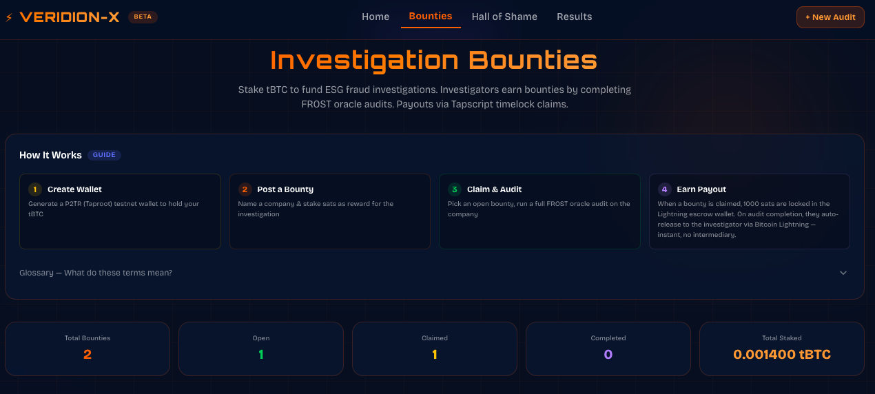 VERIDION-X is a bounty marketplace where investigators earn Bitcoin for catching corporate greenwashing. Post a company. An investigator claims the bounty. Our oracle network runs a live audit against real government data EIA renewable percentages, EPA emissions, SEC filings, NASA satellite imagery. If fraud is detected, the investigator gets paid in Bitcoin. Under one second. No bank. No intermediary.