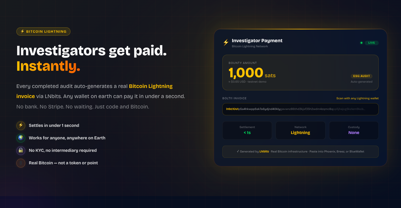 Most corporate ESG claims are never verified. Investors can't tell the difference between actual sustainability and marketing fiction. There's no economic incentive to find fraud and no payment system that lets investigators anywhere on Earth get paid for finding it.