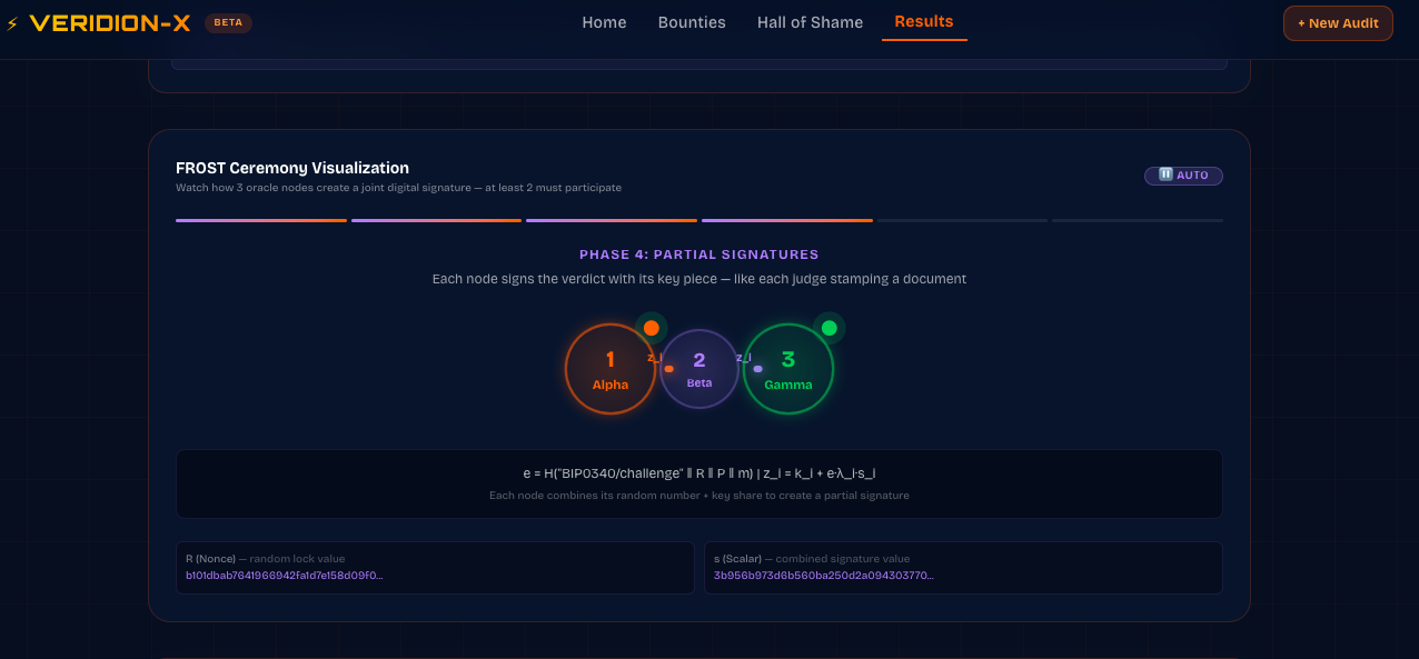 Real FROST 2-of-3 threshold signatures. Not simulated. The verdict is cryptographically multi-signed.