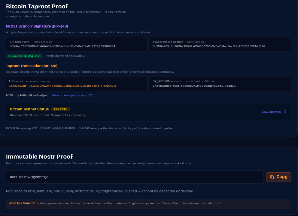Bitcoin Taproot proofs on testnet. Verdicts are permanently recorded via OP_RETURN. Independently verifiable forever.