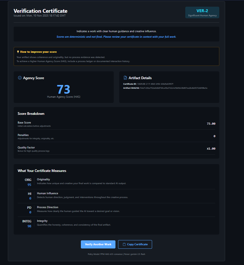 Vision: Every significant AI-assisted work should have a VerifAI certificate—not as gatekeeping, but as transparency. Like nutrition labels for food, but for creative agency.