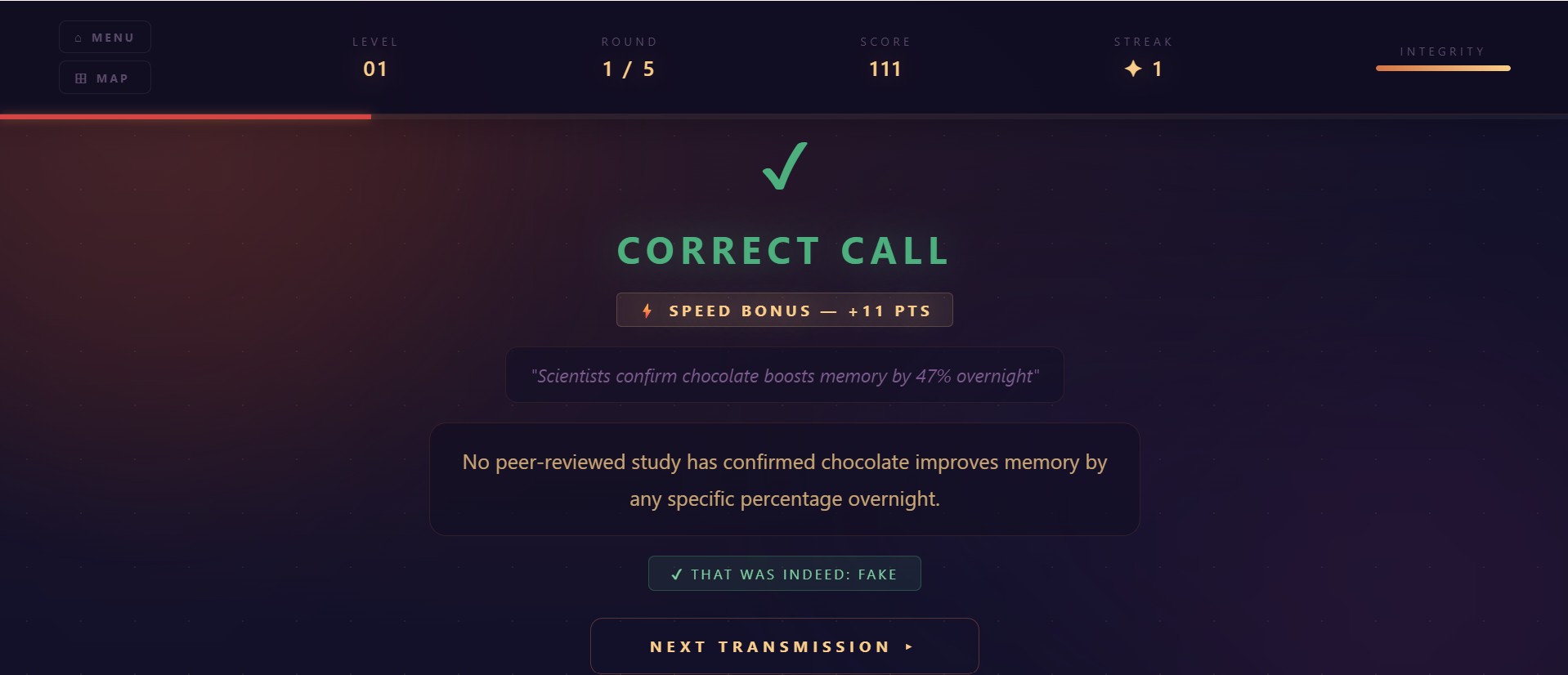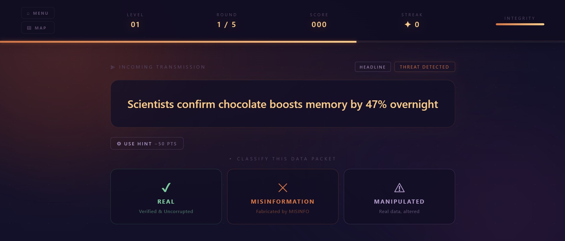 Verify It! is a 5-level browser game where players classify AI-generated content (news headlines, social posts, statistics, and viral images) as real, fake, or manipulated before the MISINFO virus corrupts the archive. The game features: