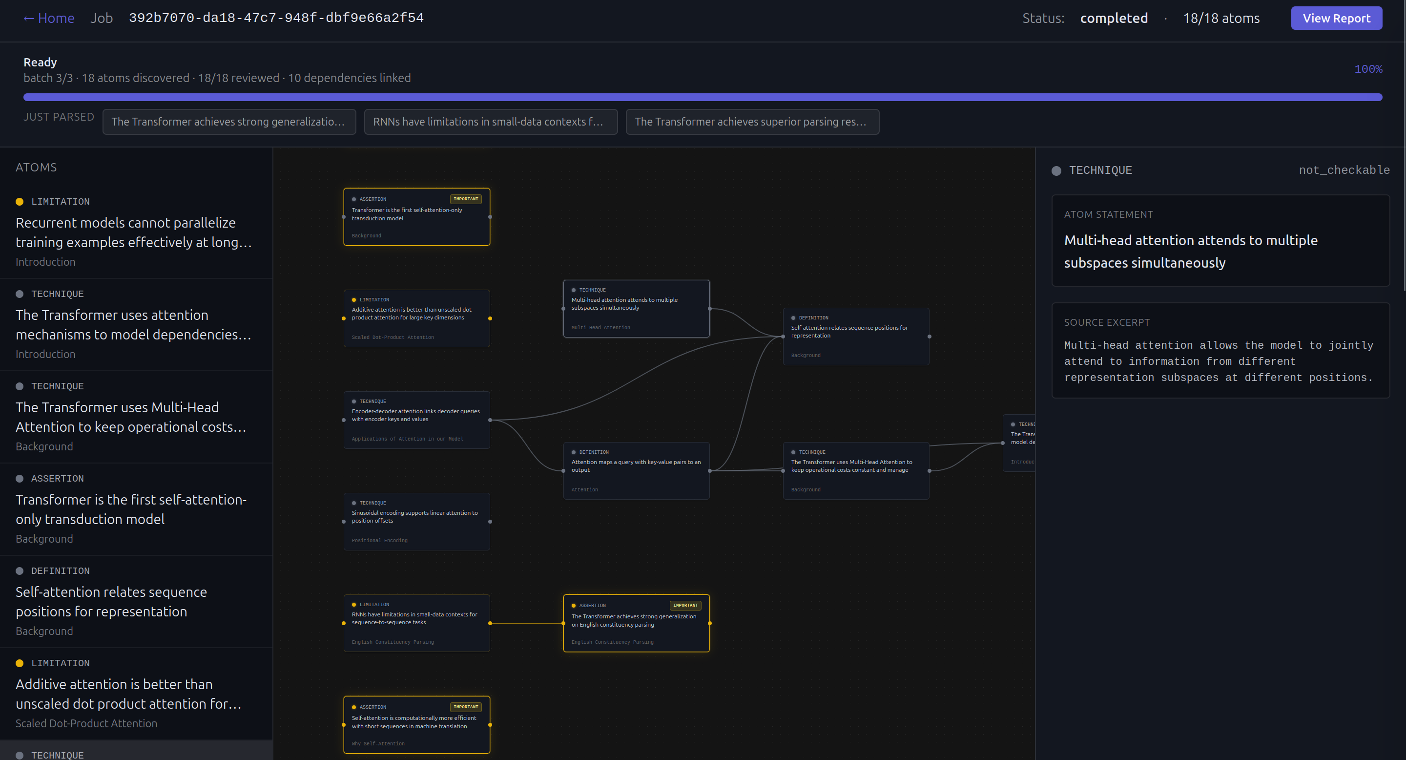 Peer Review: Upload any paper. Veritas decomposes every claim into atomic units, maps their logical dependencies into a DAG, and runs adversarial agents to verify, challenge, and cross-reference each one against the literature. Every claim exits as verified, contested, or falsified. If a lemma breaks, every downstream theorem that depends on it is automatically flagged for review.