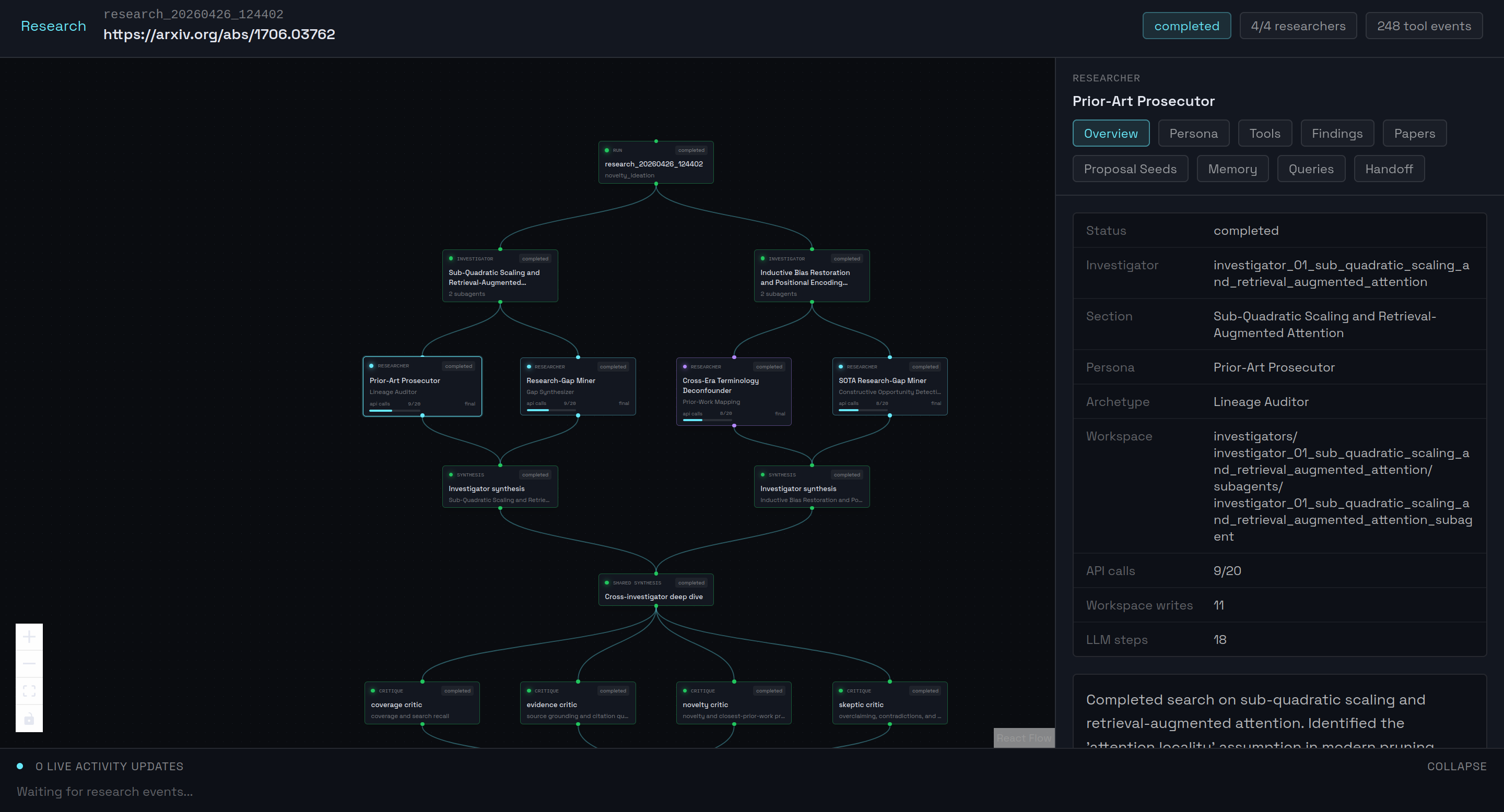 Deep Research: Multi-agentic swarm for literature synthesis. Surface related work, contradictions, and open problems across arXiv and Semantic Scholar. Allows the user to surface gaps in literature and generate hypothesis for their research.