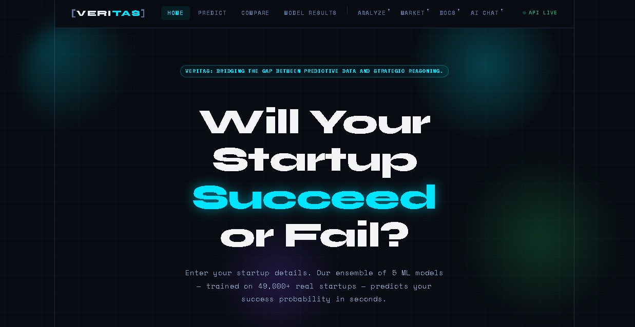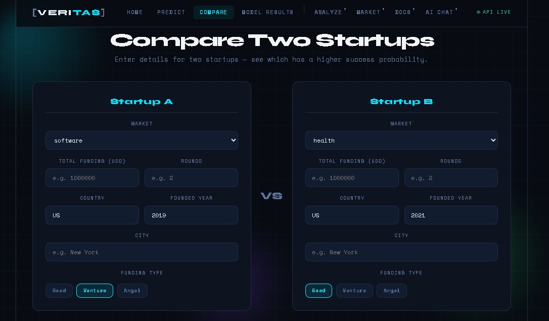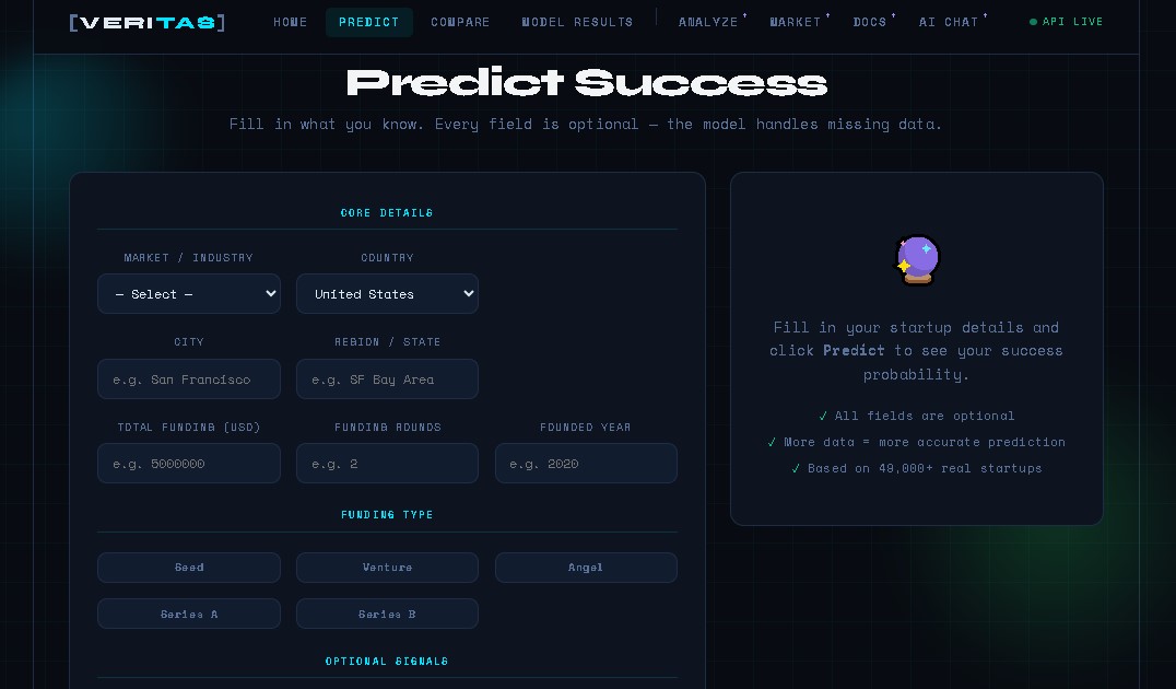 Veritas is an AI-powered decision-support platform that evaluates a startup’s likelihood of success.