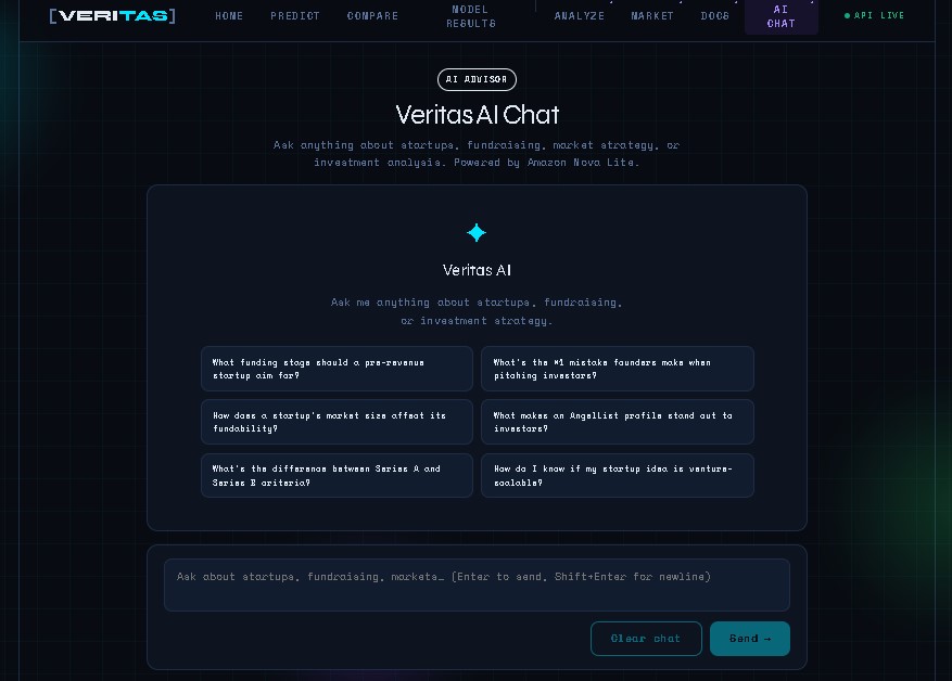 Veritas AI Chat: A real-time conversational advisor for fundraising, market strategy, and investment due diligence.